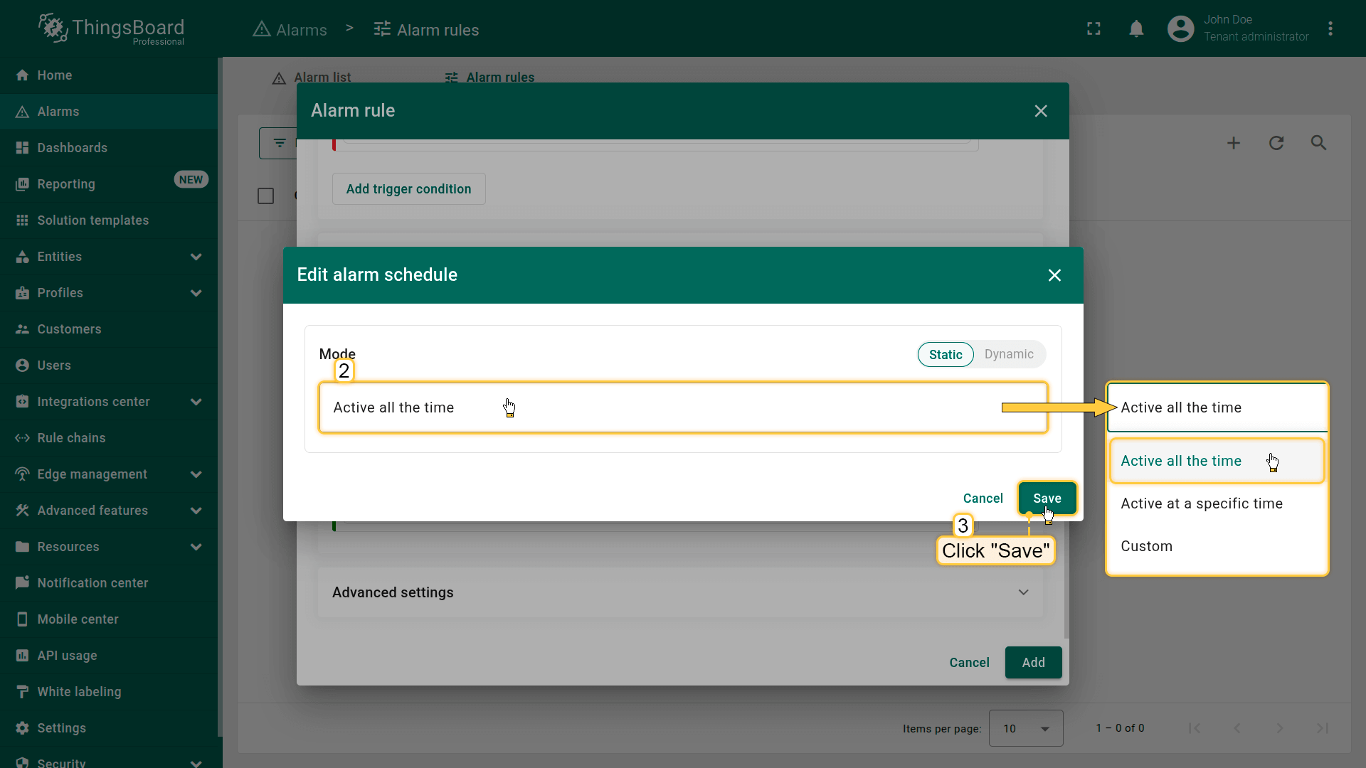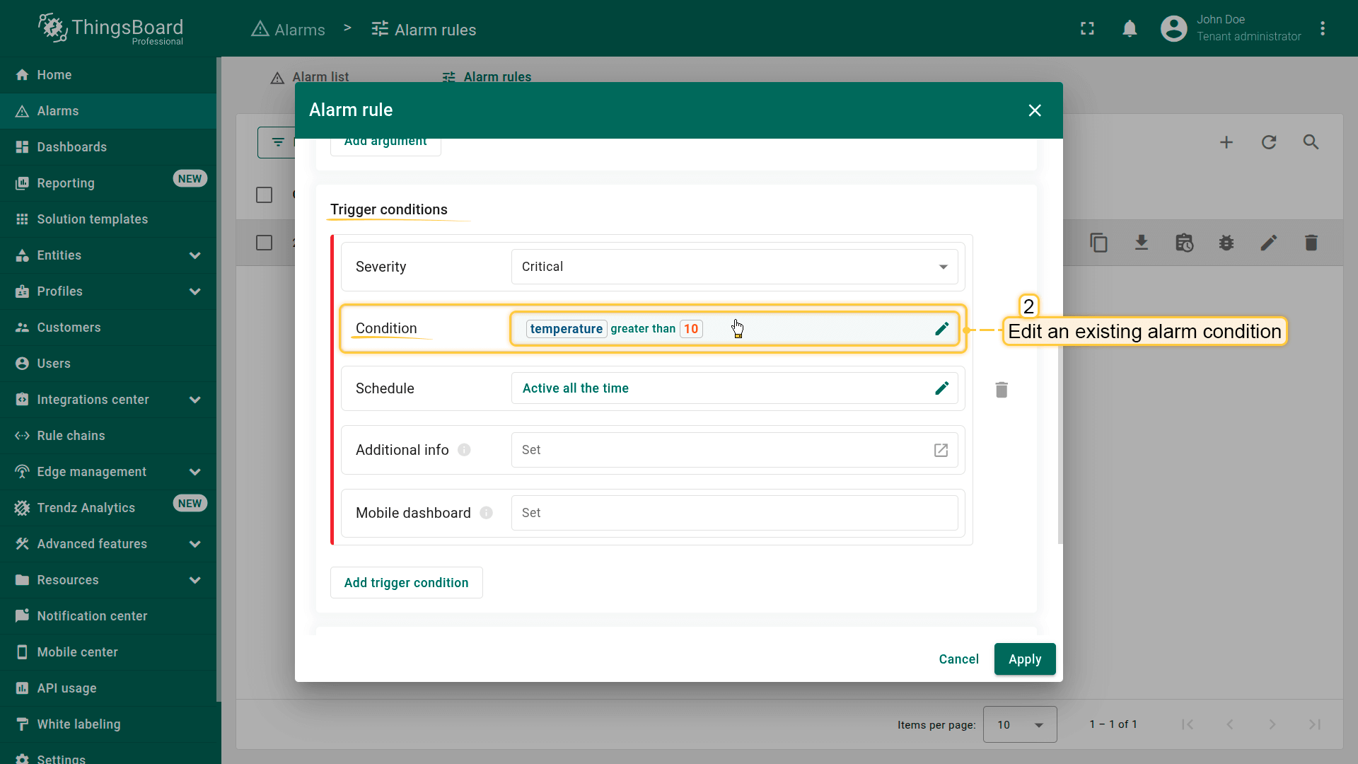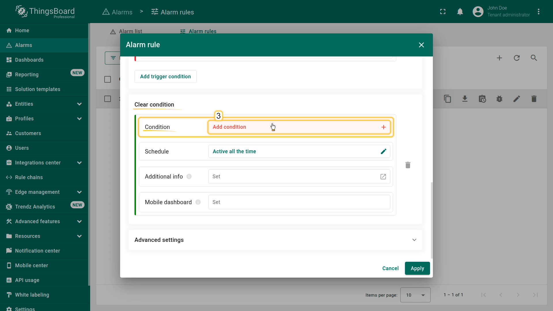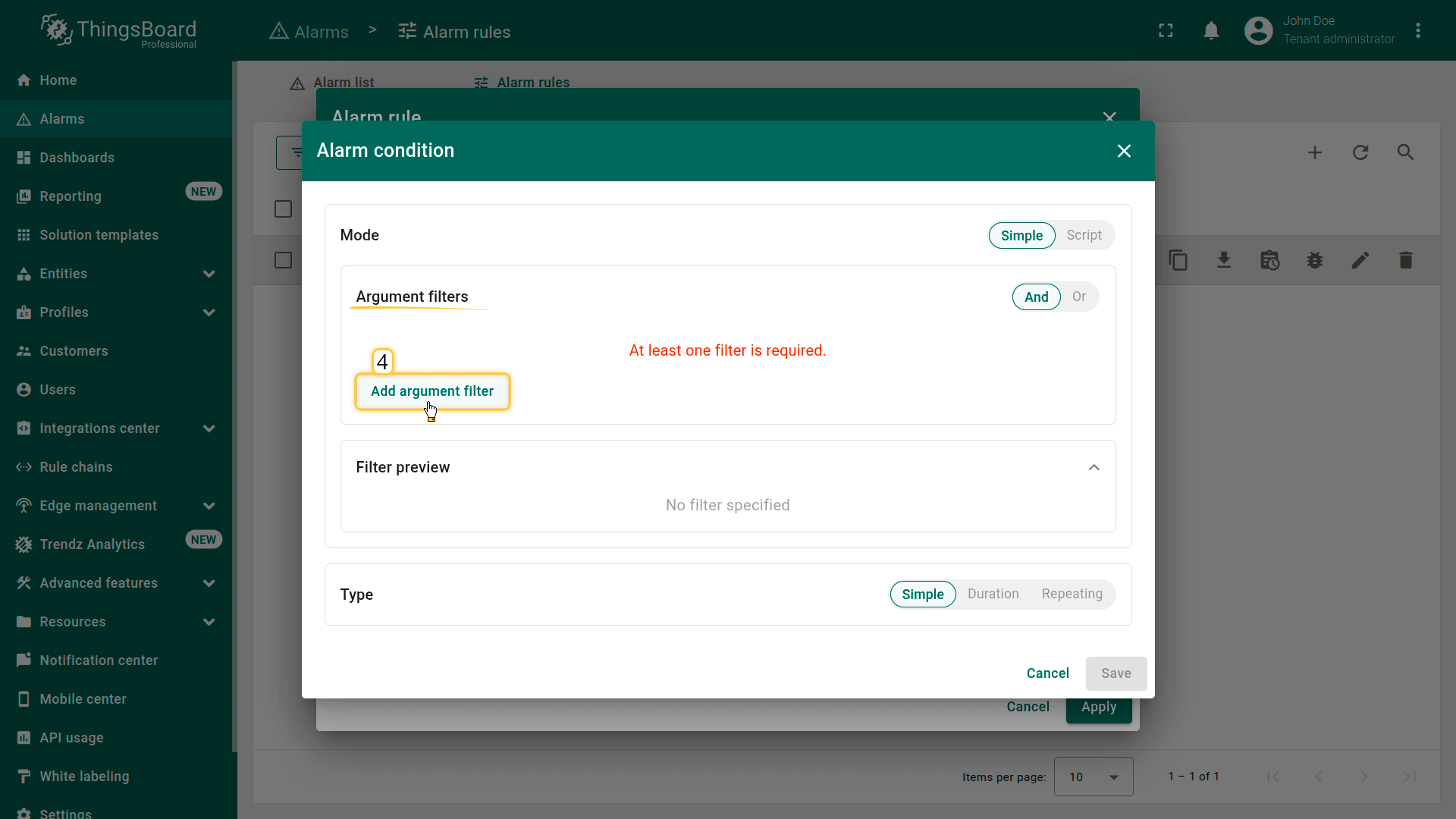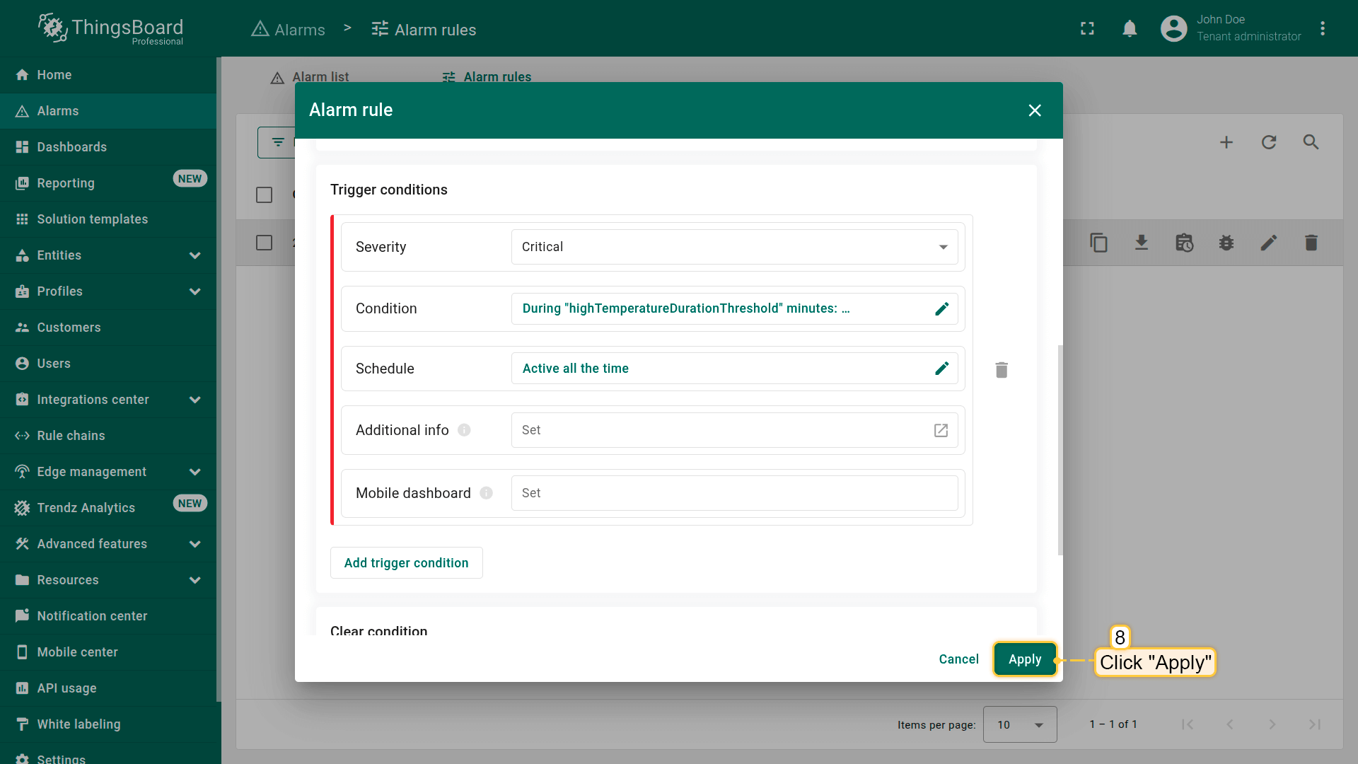 Note: The process of creating an alarm rule is the same for Devices, Assets, Device profiles, Asset profiles, and Customers.