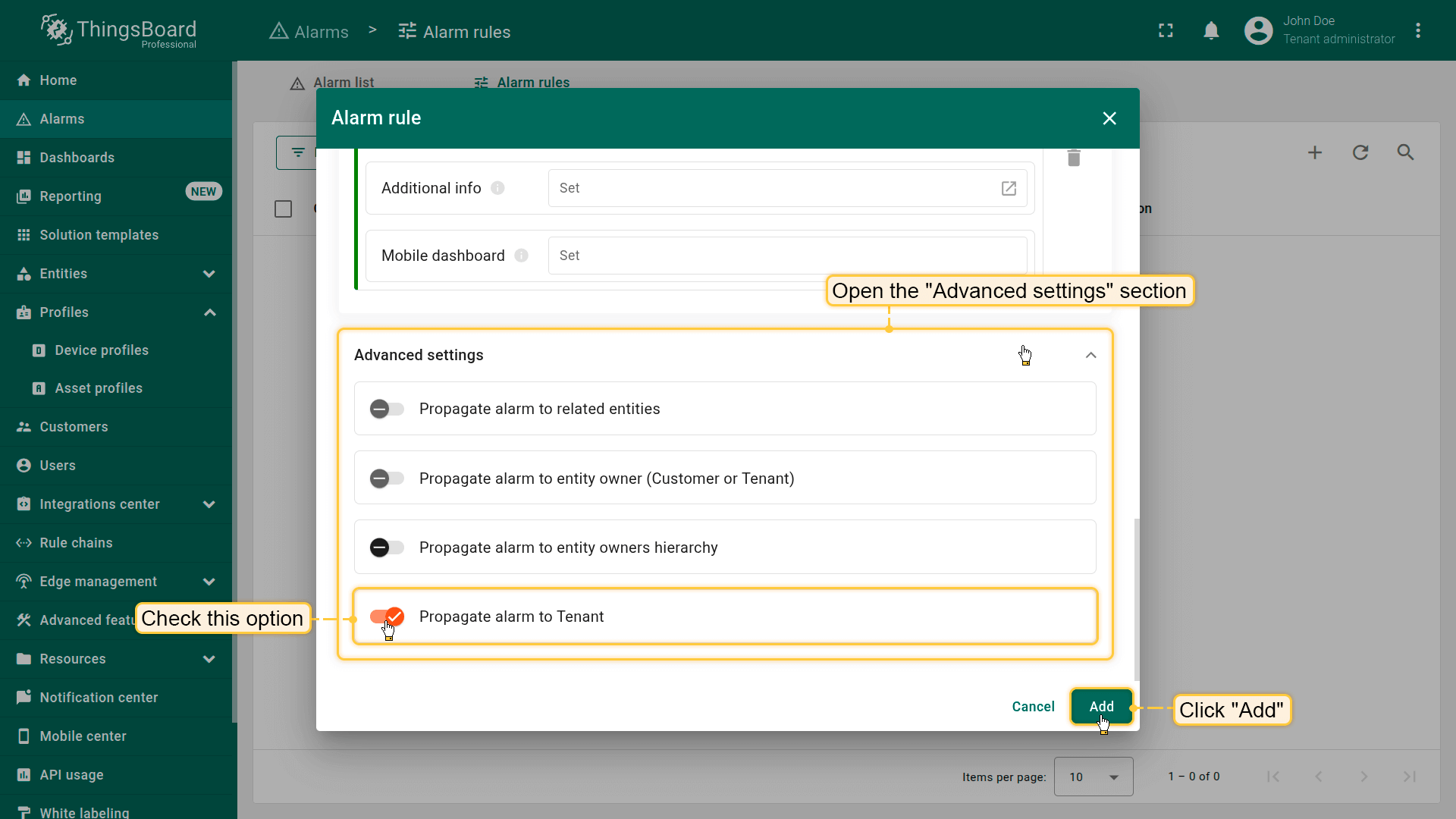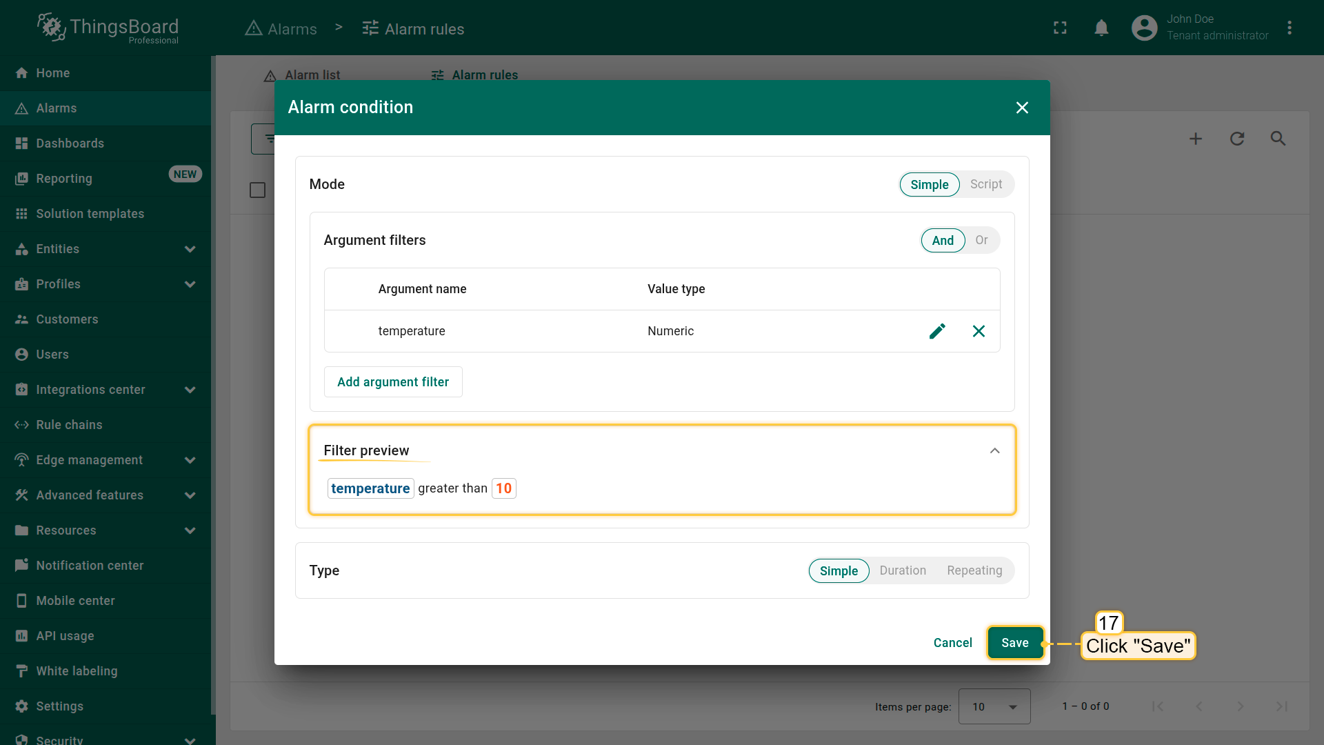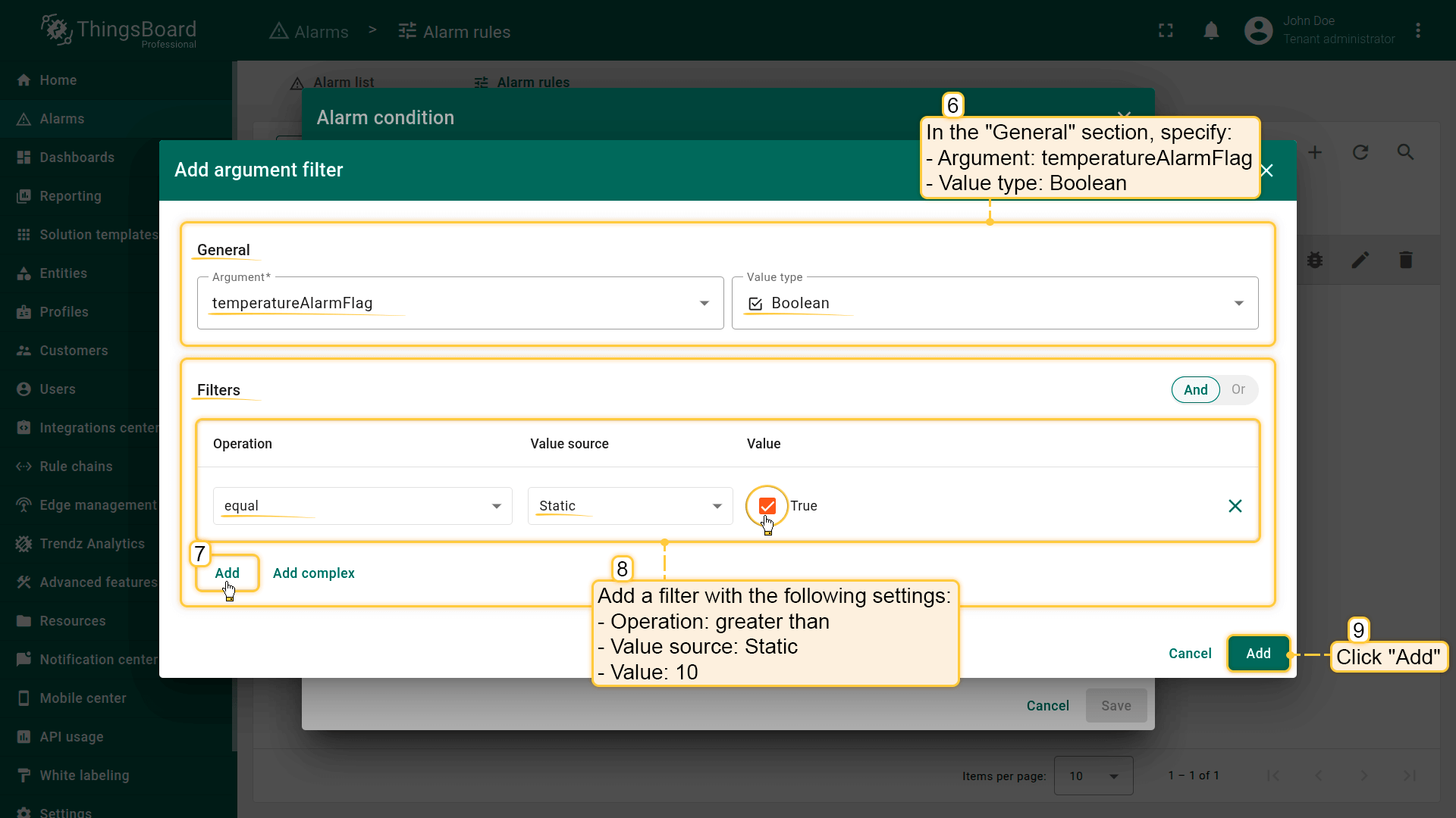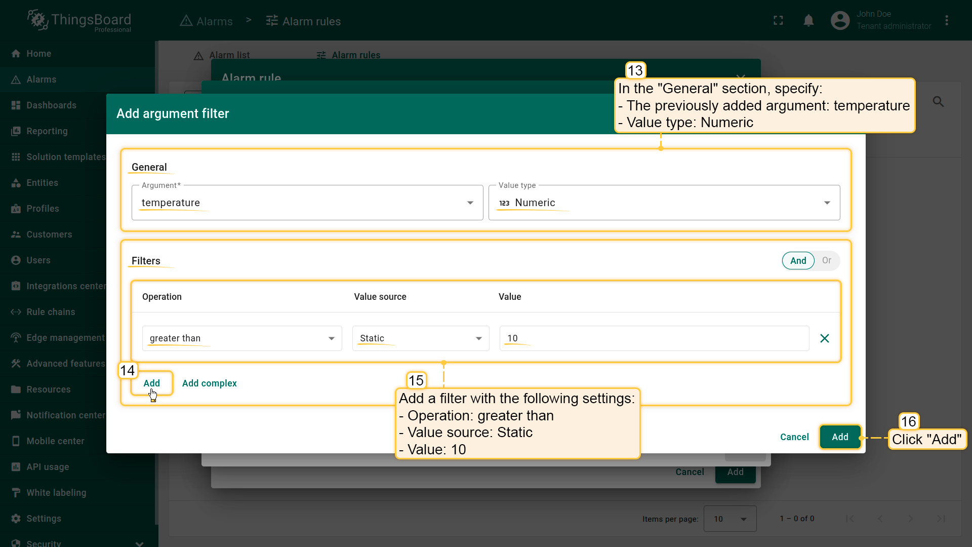 Note: The process of creating an alarm rule is the same for Devices, Assets, Device profiles, Asset profiles, and Customers.