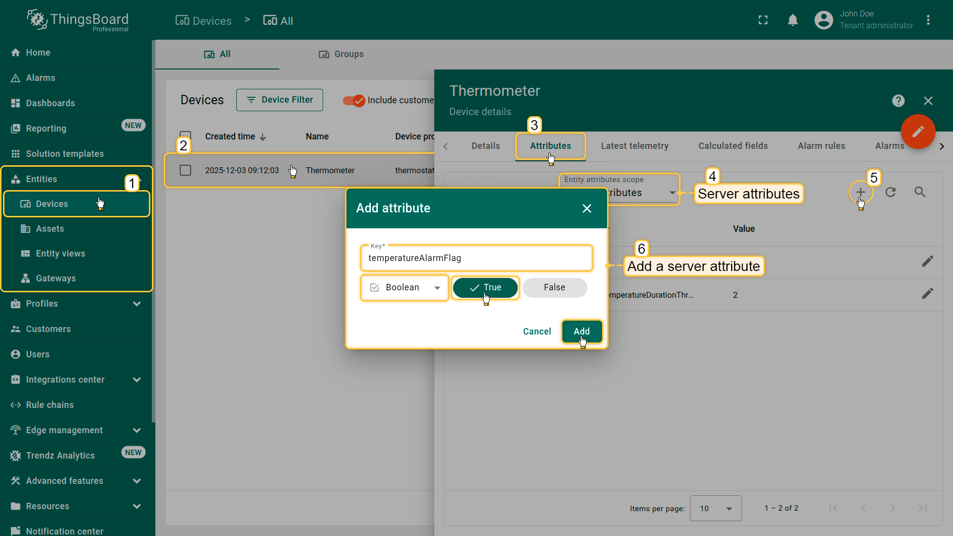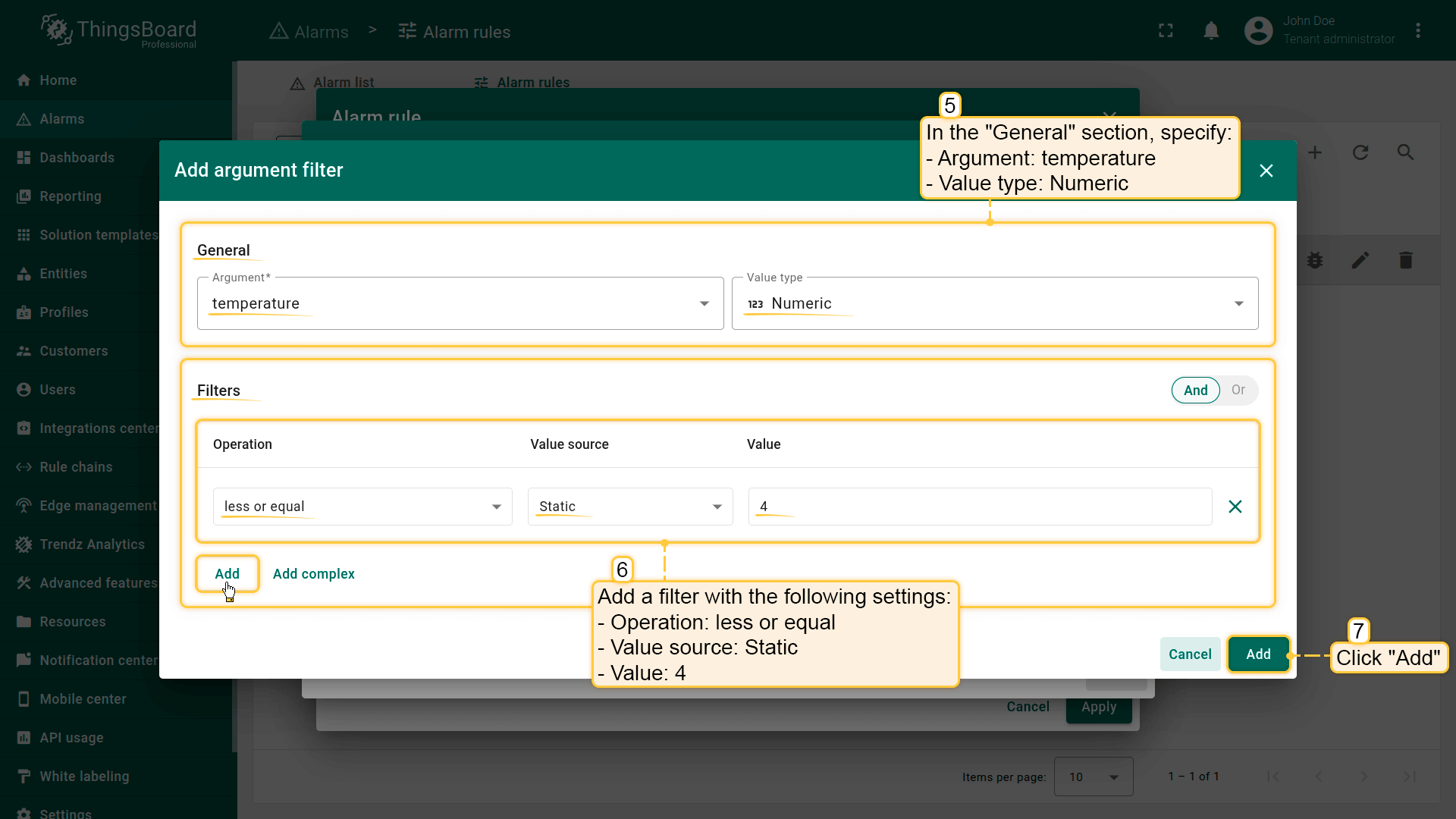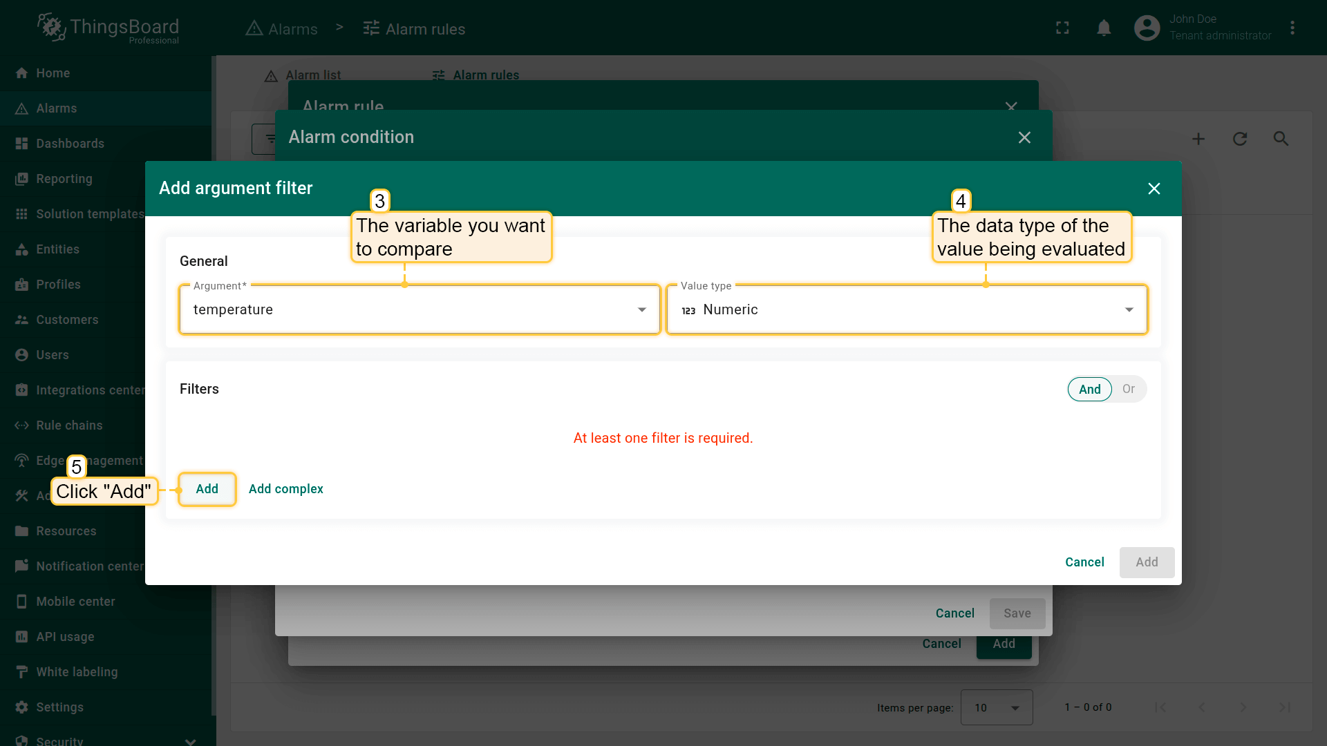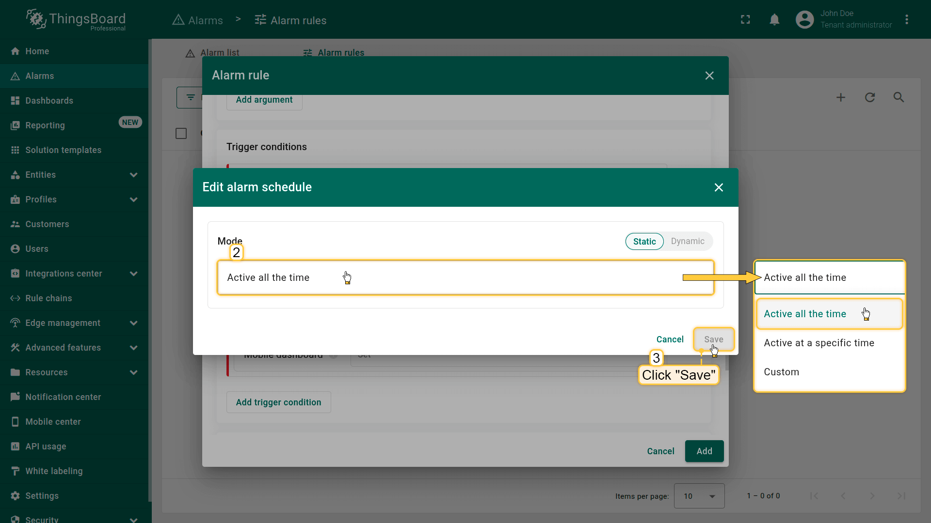 Note: The process of creating an alarm rule is the same for Devices, Assets, Device profiles, Asset profiles, and Customers.