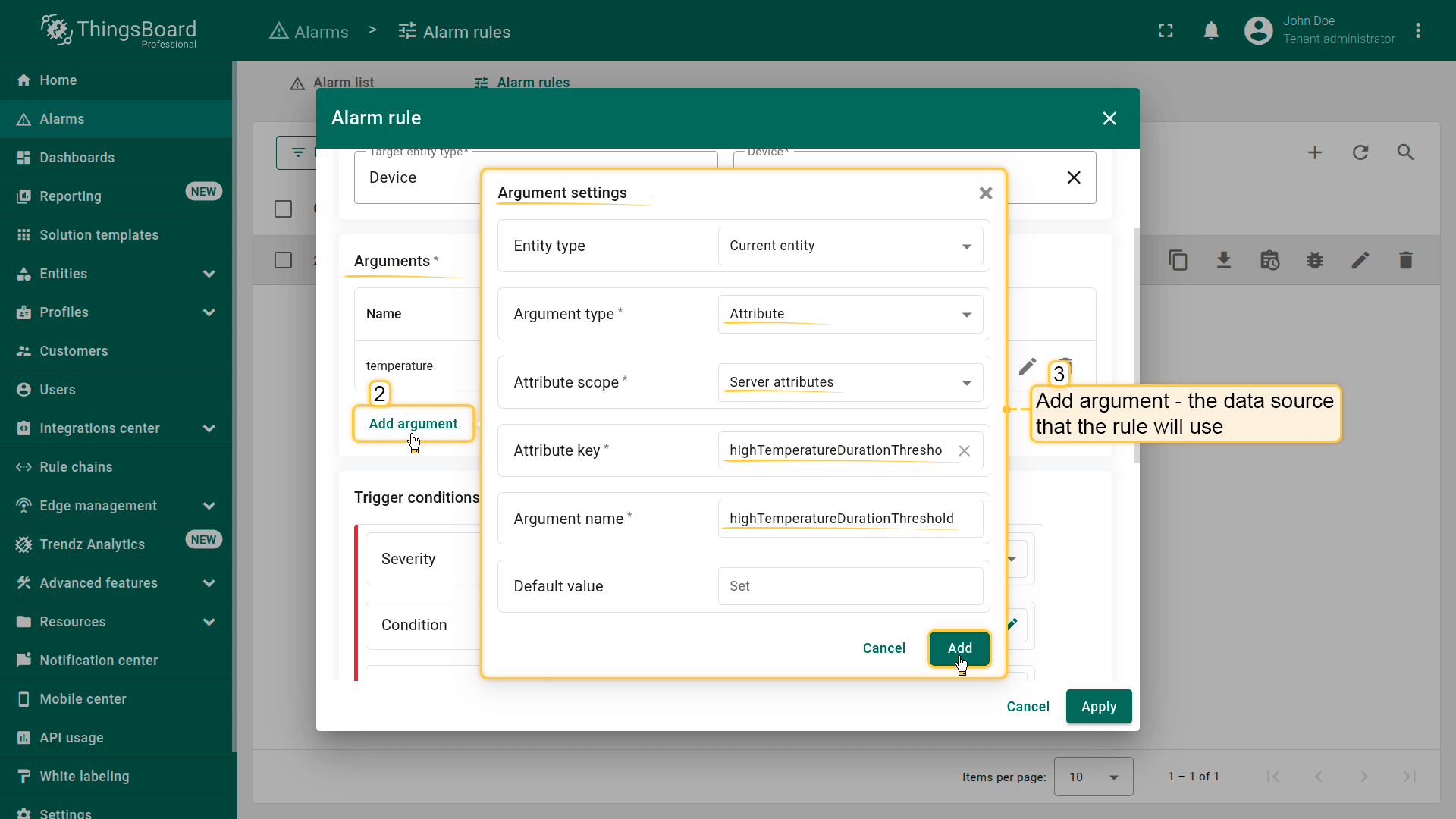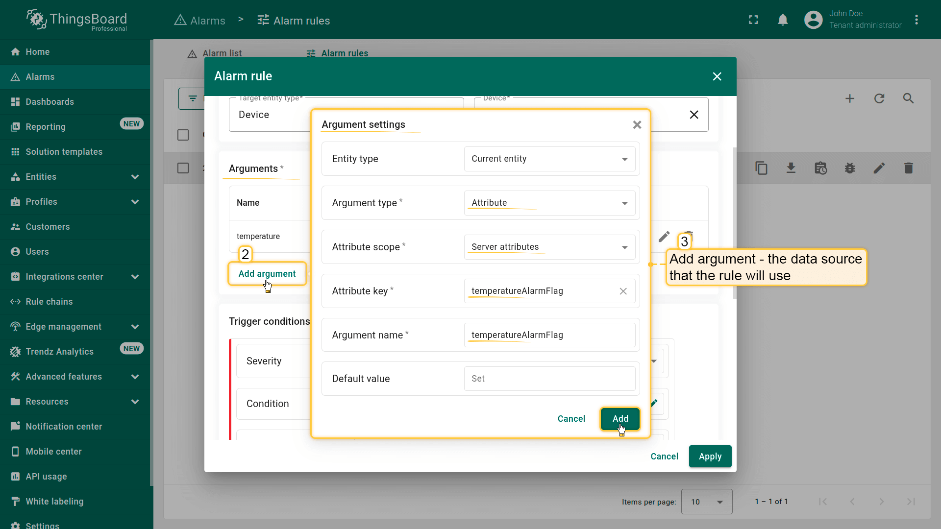 Before defining alarm conditions, you must add at least one argument — a data source that the rule will use during evaluation.