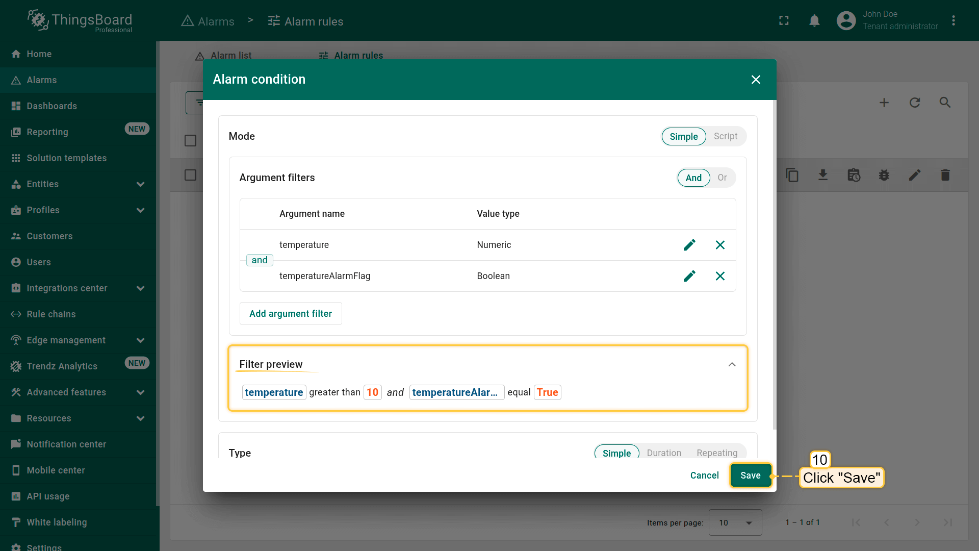 With this configuration, ThingsBoard will check whether the threshold condition occurs three times in a row before creating the alarm.