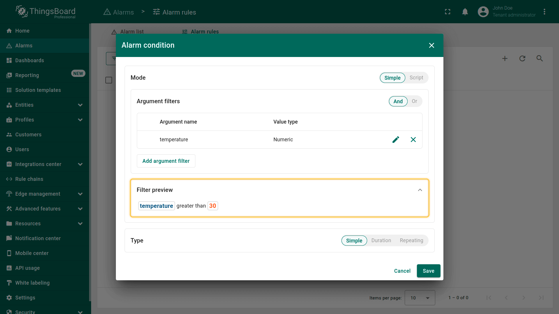 - Alarm type — the name and unique identifier of the alarm (for example, “High Temperature”). The alarm type defines which event the alarm represents and allows ThingsBoard to determine whether a new alarm should be created or an existing active one should be updated.