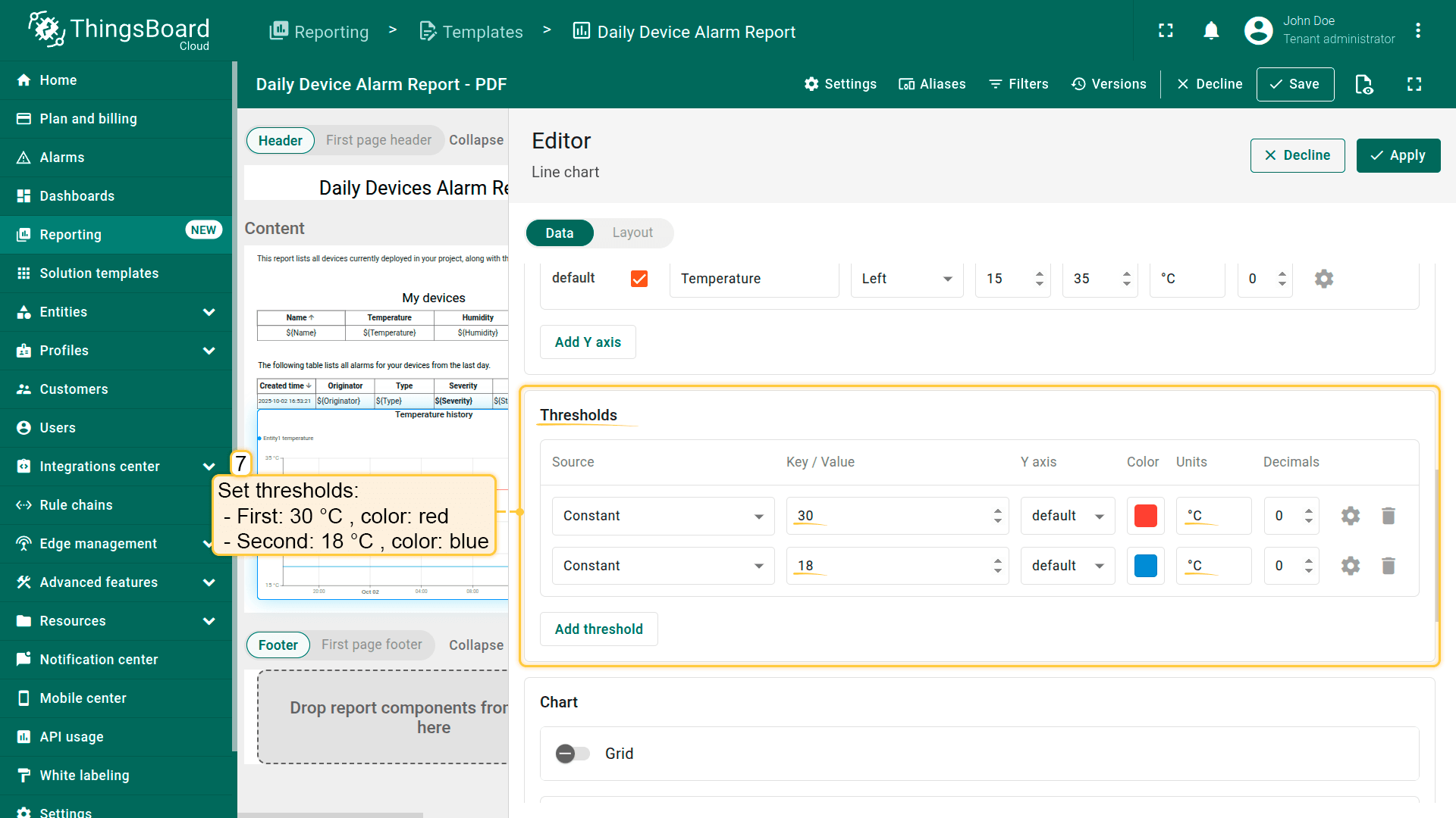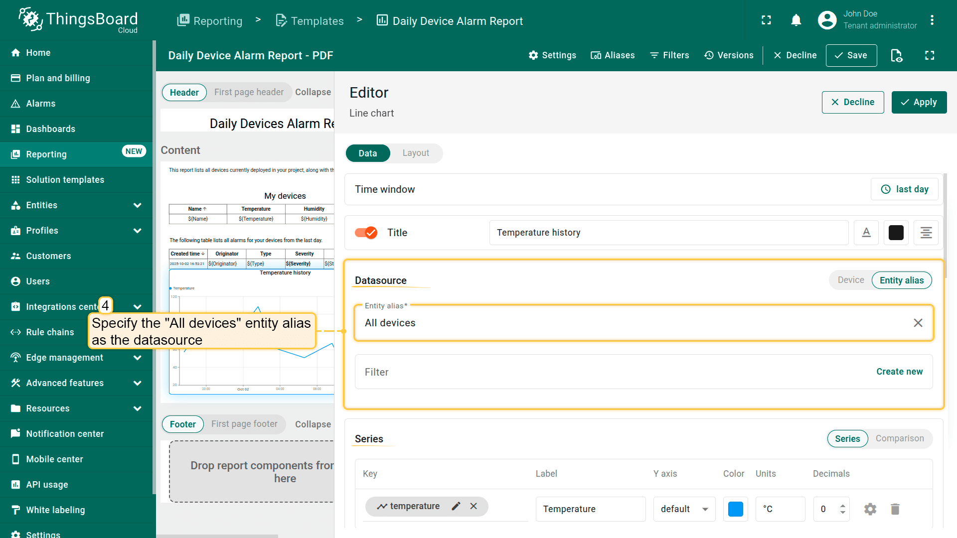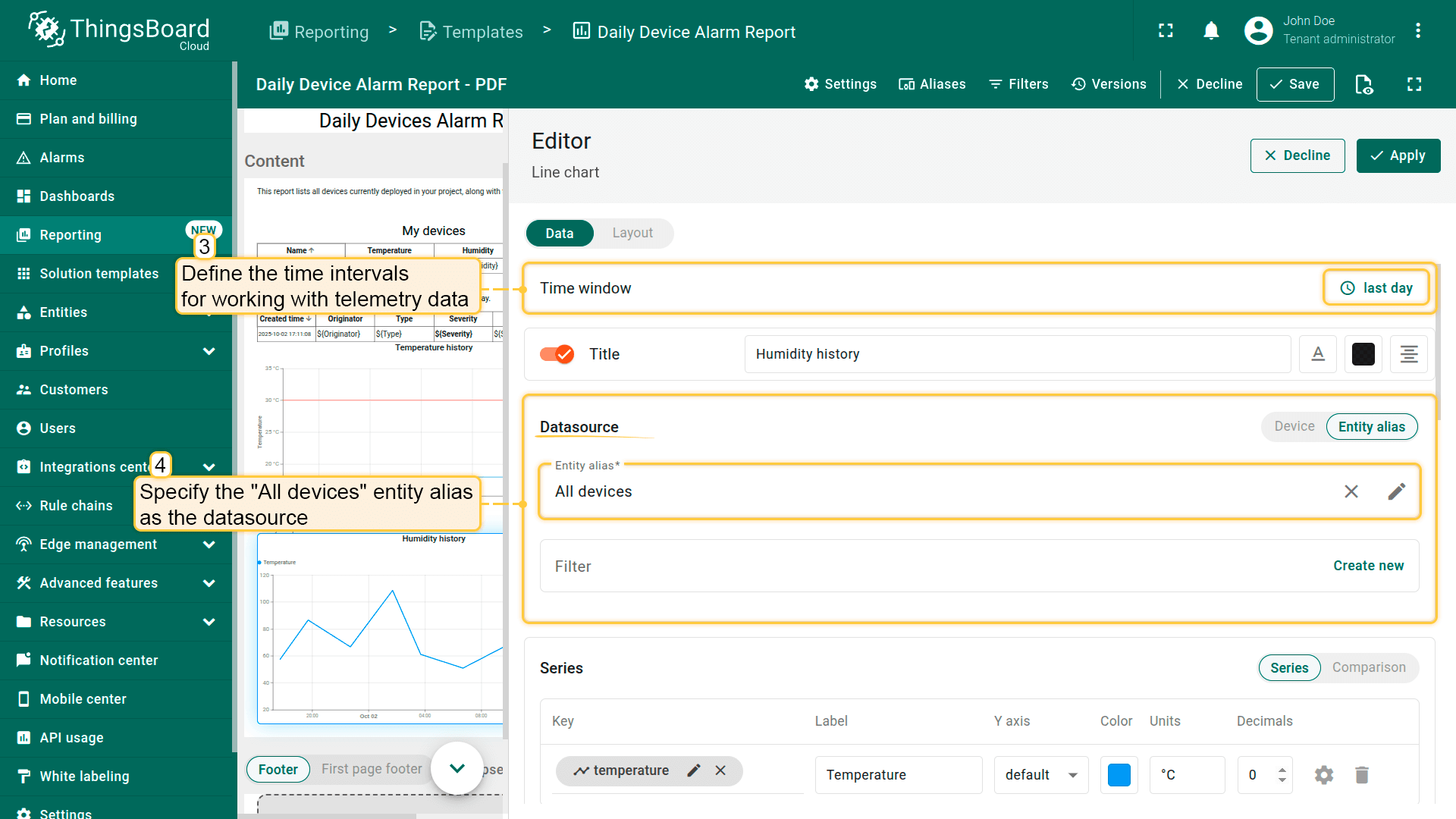In this guide, we'll walk through the basic steps of using Reporting in ThingsBoard, and create a report template with automated delivery configured for two different customers.