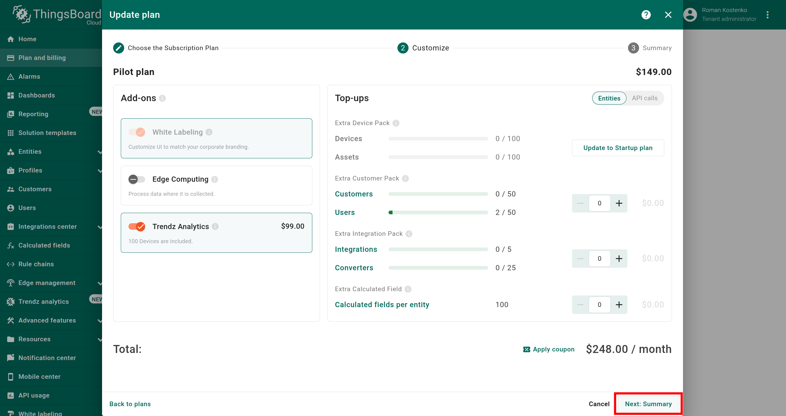 You can find out up-to-date prices on Trendz add-on in the ThingsBoard billing page as it is shown on step-3.