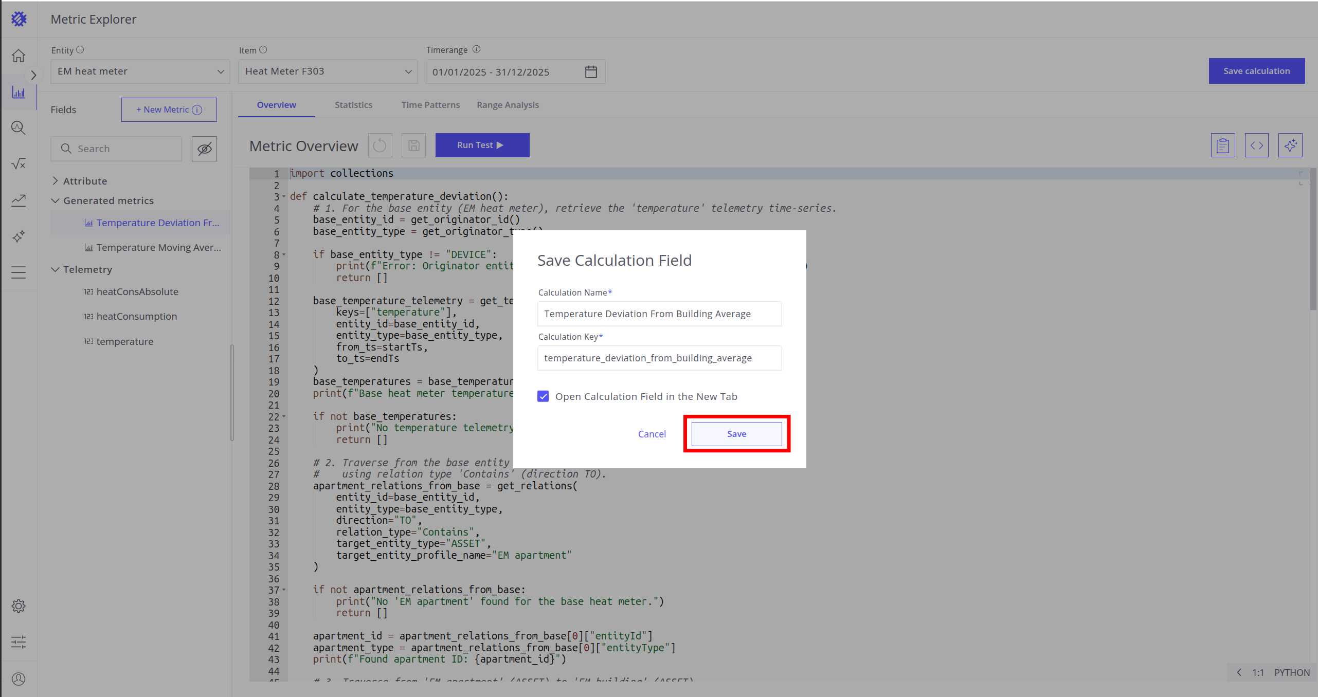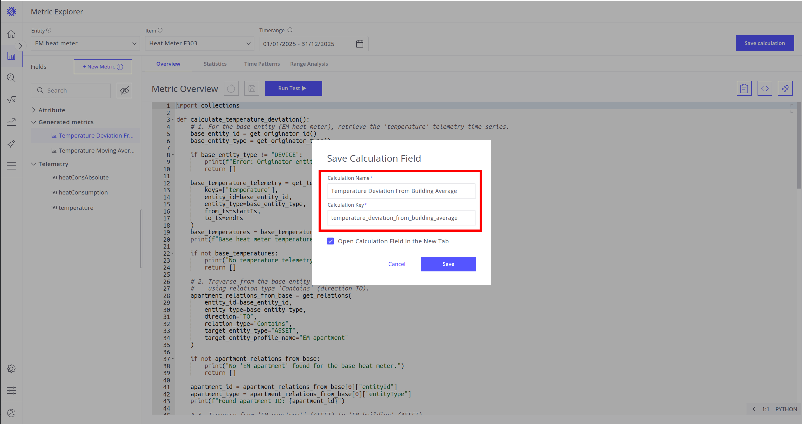 Example: You can create a metric that calculates deviations from the average temperature for sensors in a building.