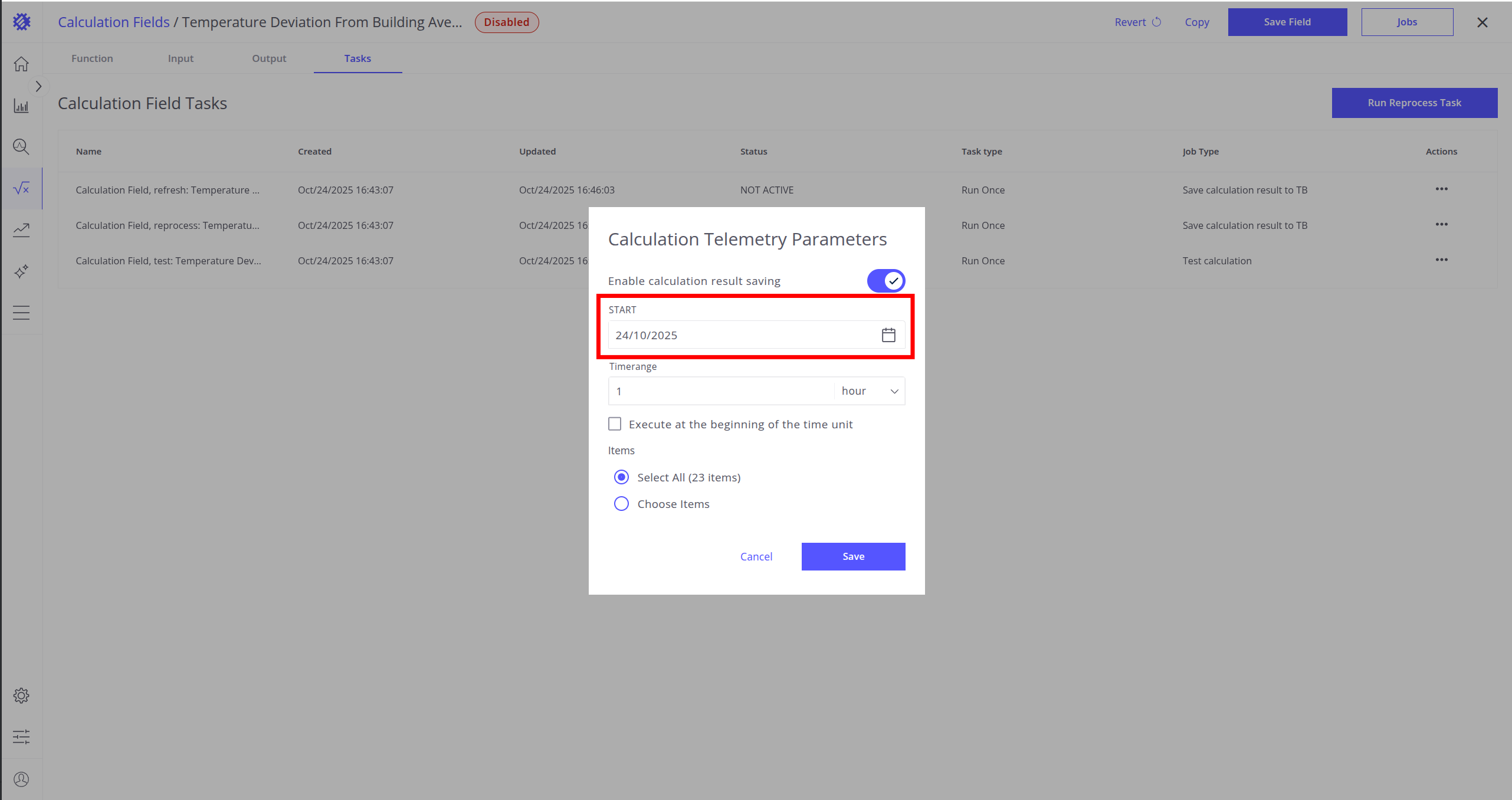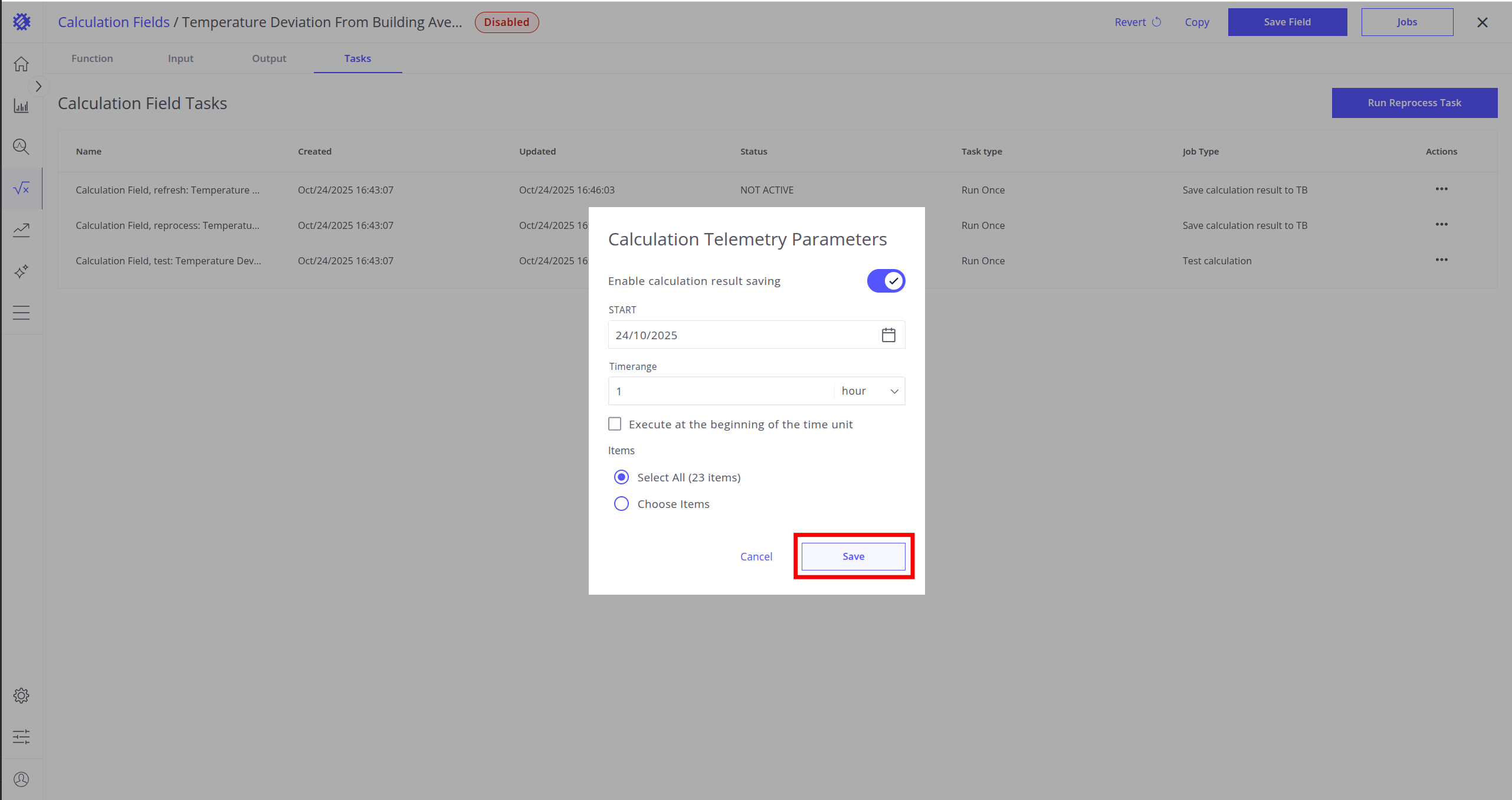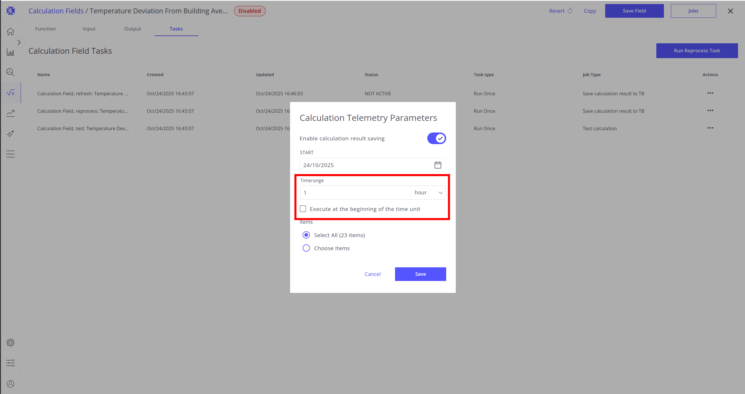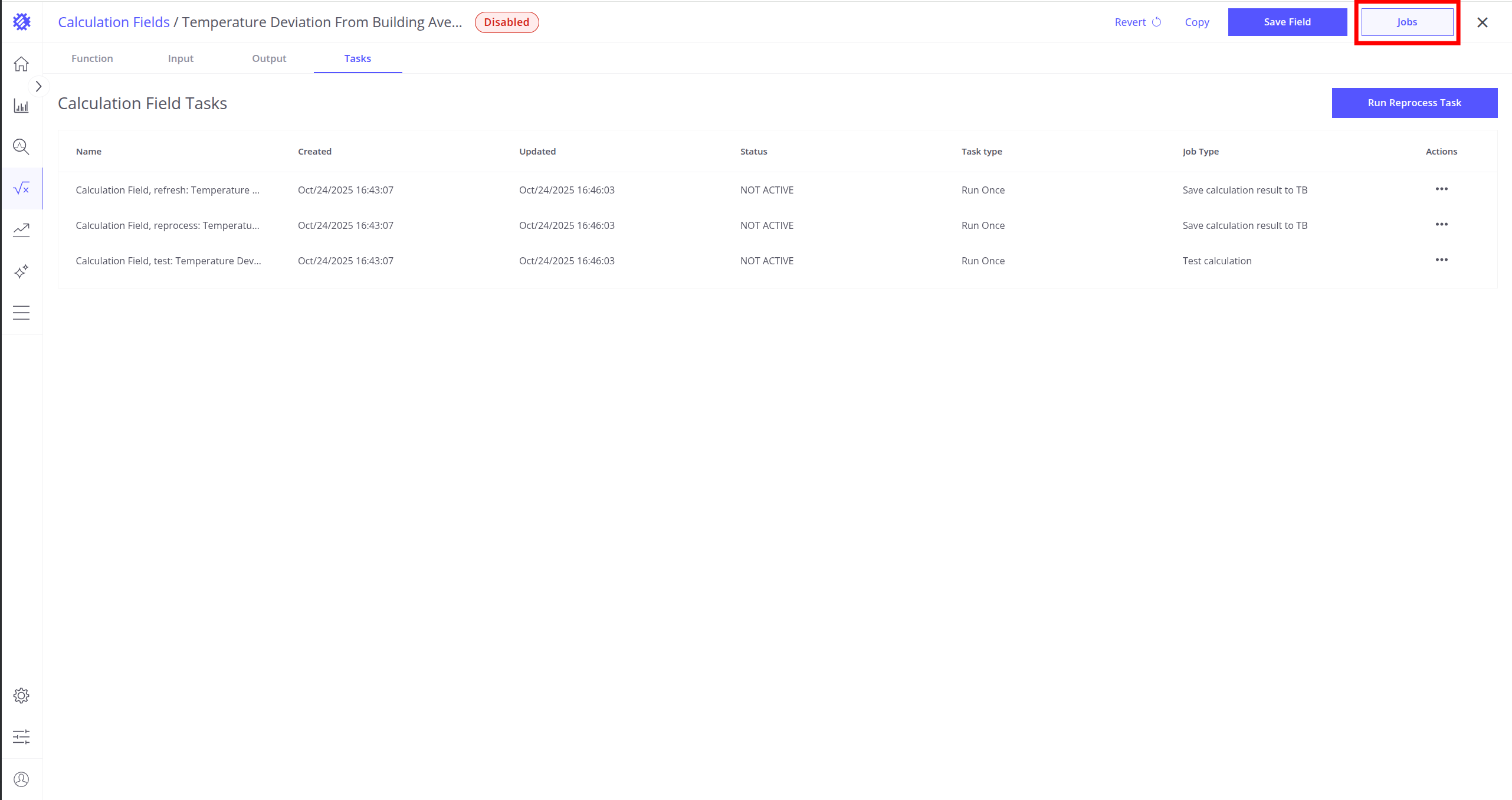 Once the calculation field is created and all parameters are set up, you can run a Reprocess Job to save historical data to ThingsBoard.