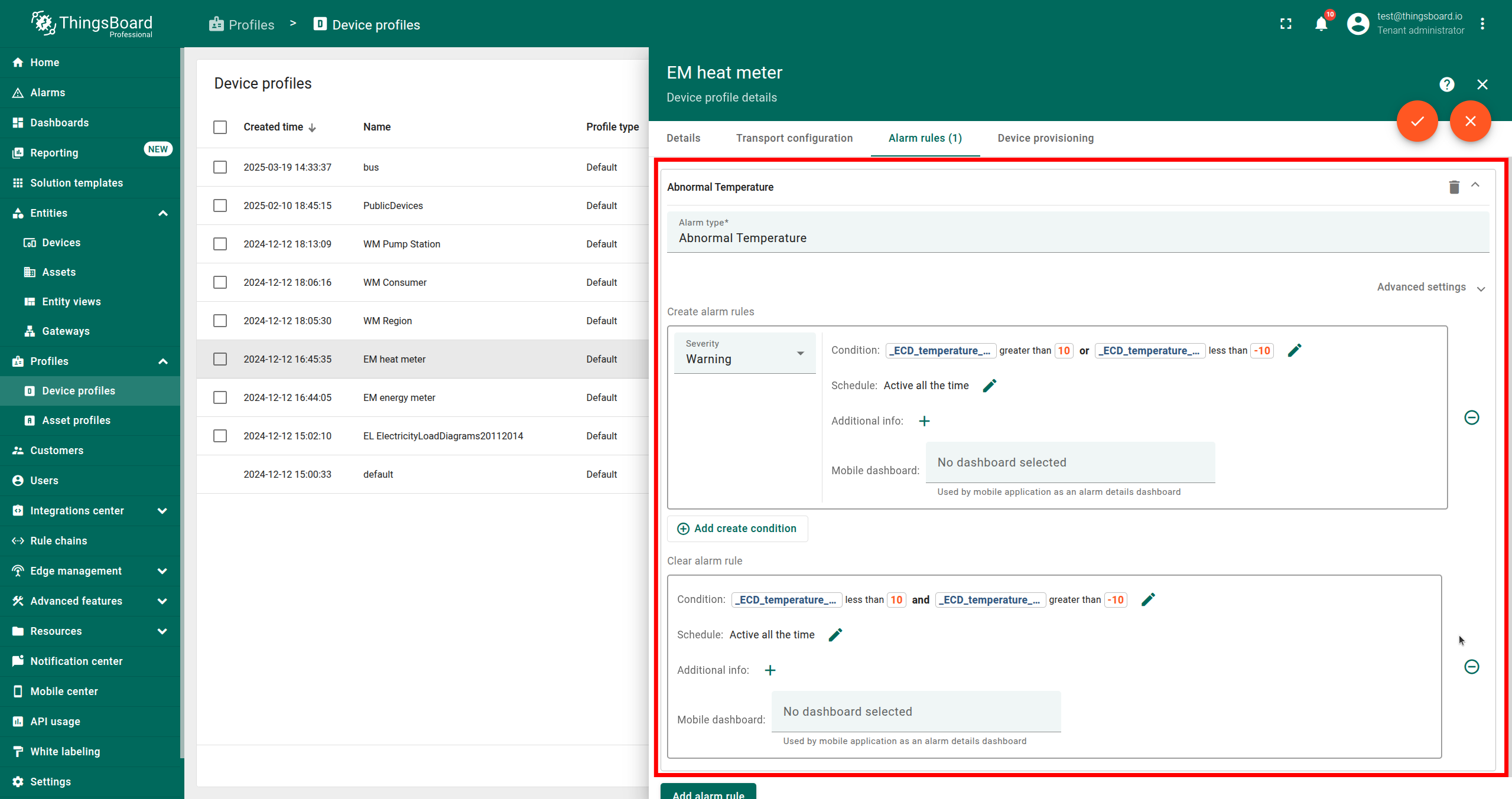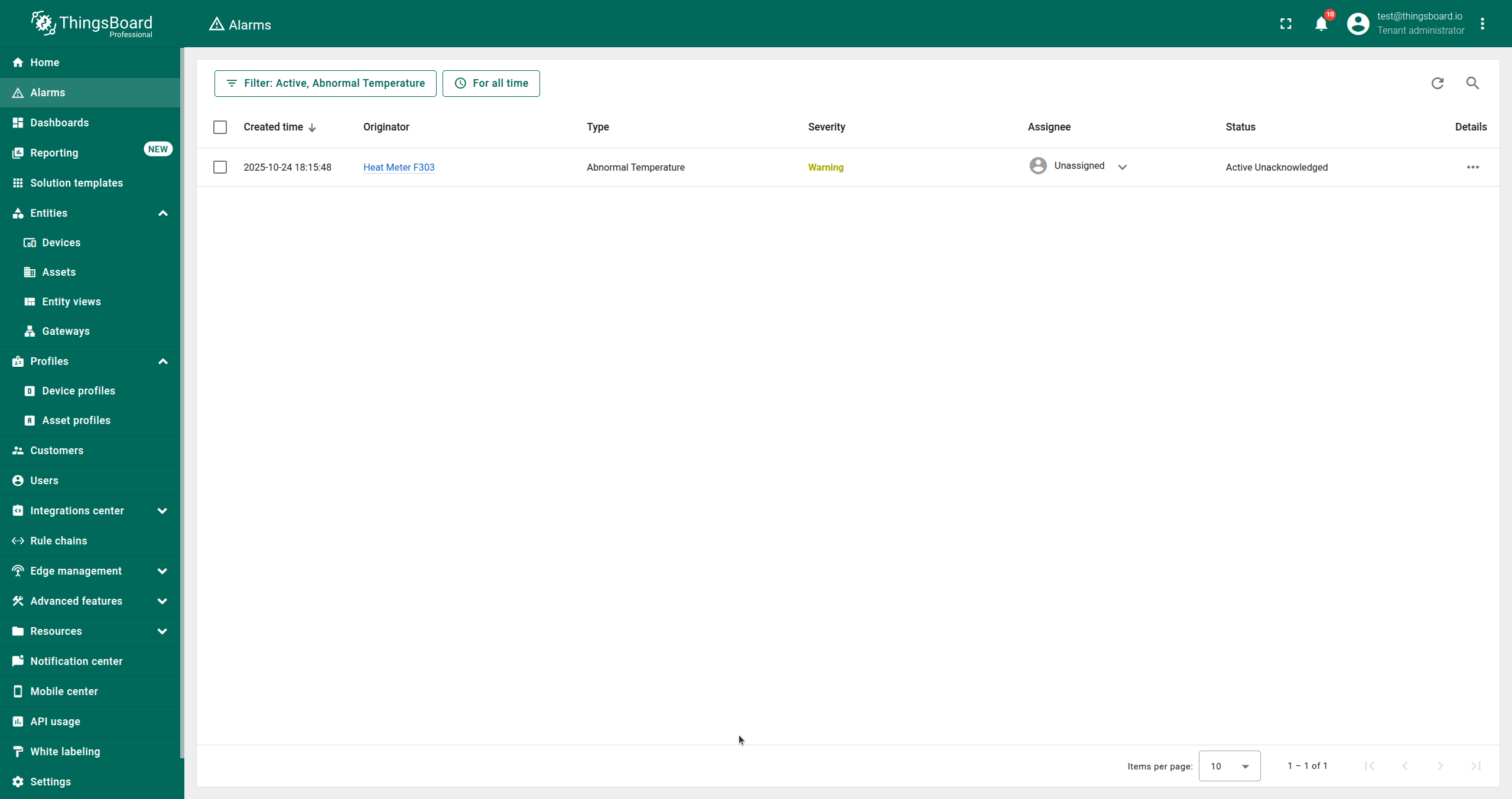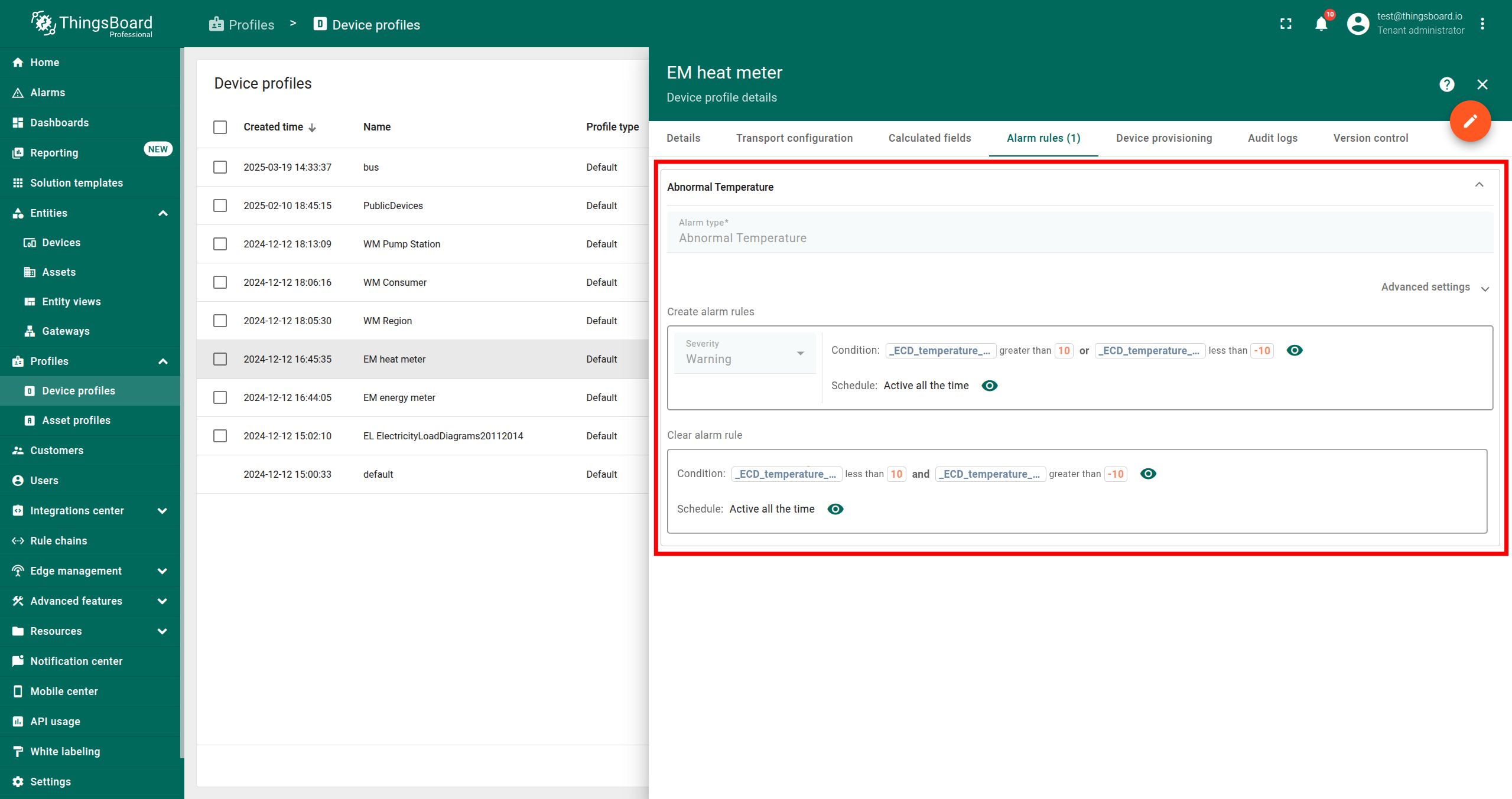 In this example, we created an alarm rule that triggers alarms when the absolute temperature deviation is greater than 10 and clears them when it is not. The alarm type is “Abnormal Temperature” and the severity is “Warning”.