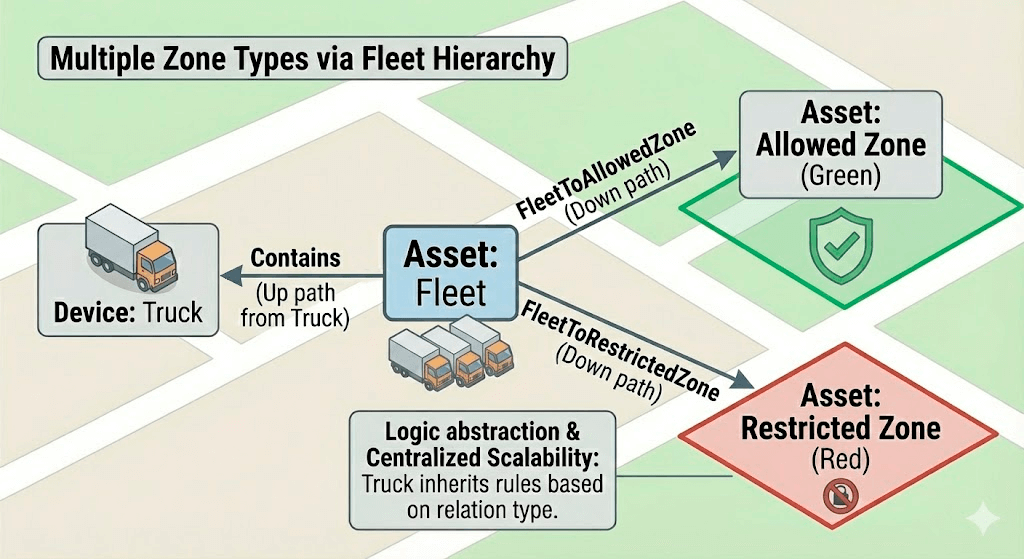 Note (visualization only): Zone assets may include a zoneType server attribute (for example, allowed / restricted) used only for map color-coding. The calculated field logic relies on relation types, not on zoneType.