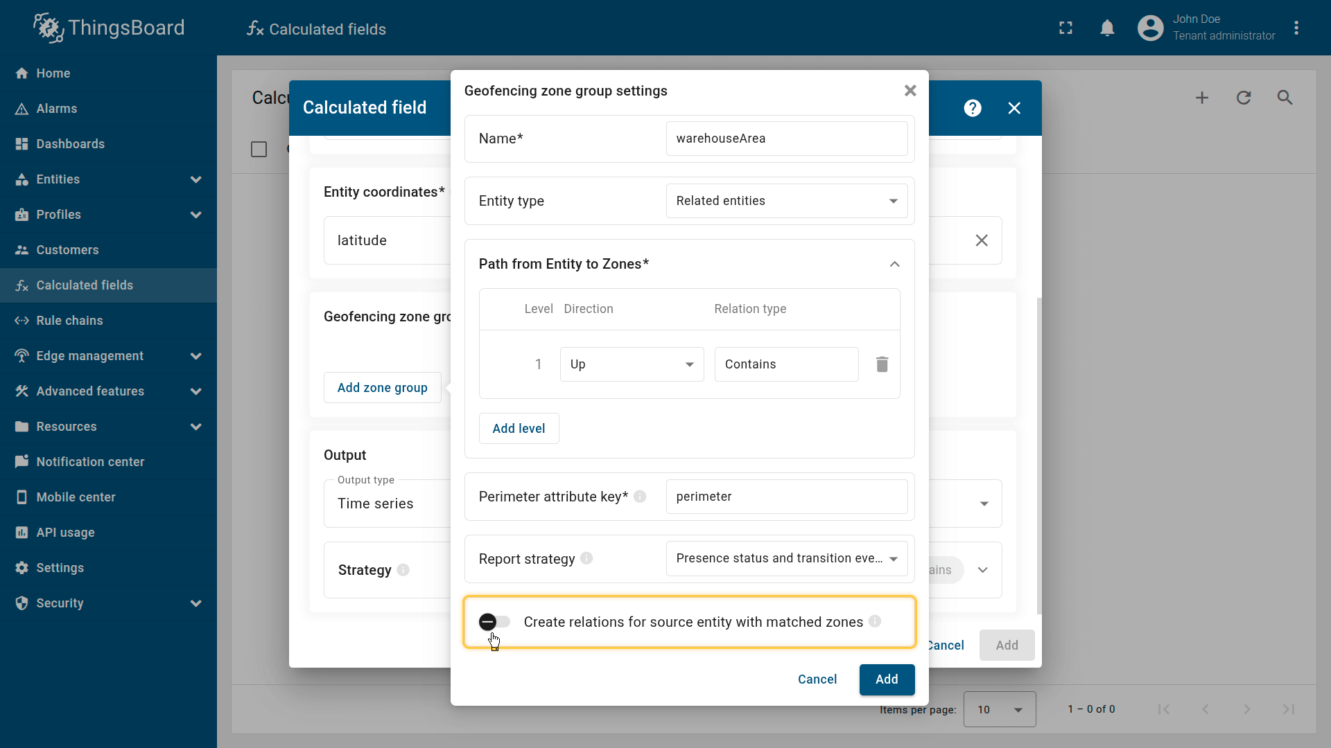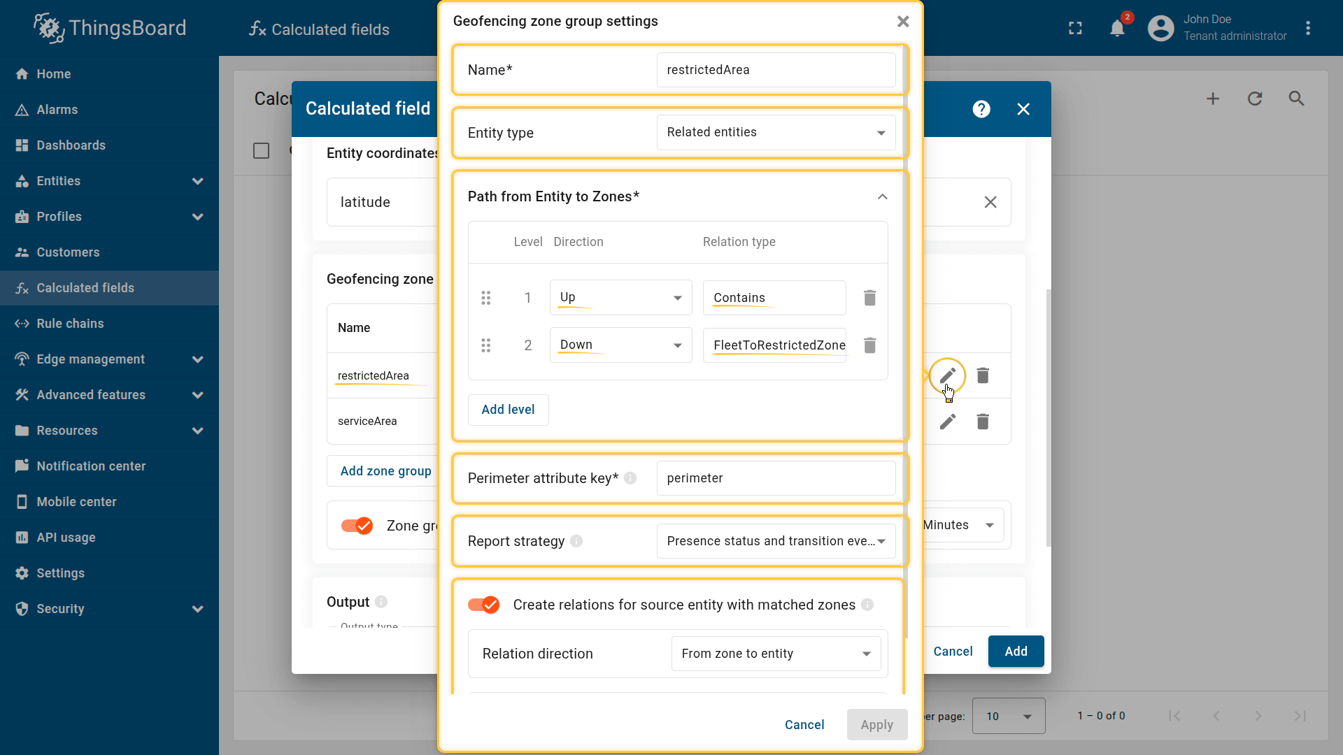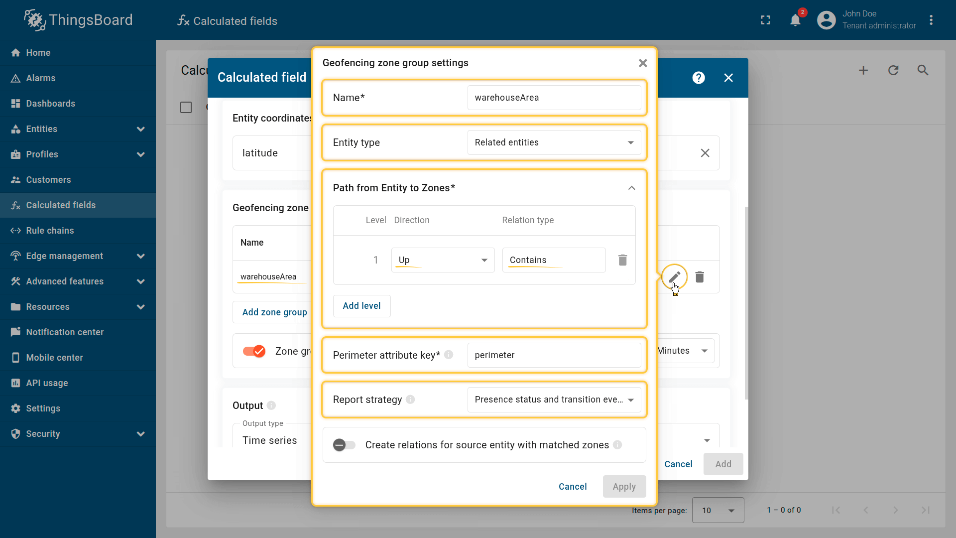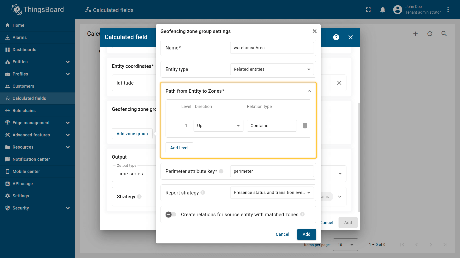 How it works: The calculated field retrieves the perimeter attribute from the Tenant or Customer that owns the entity. The device effectively inherits a zone defined at the business level.