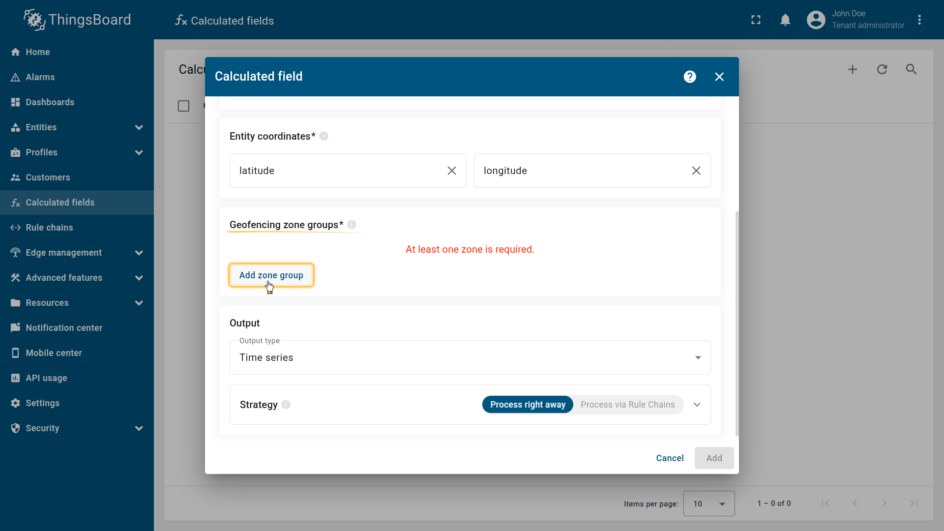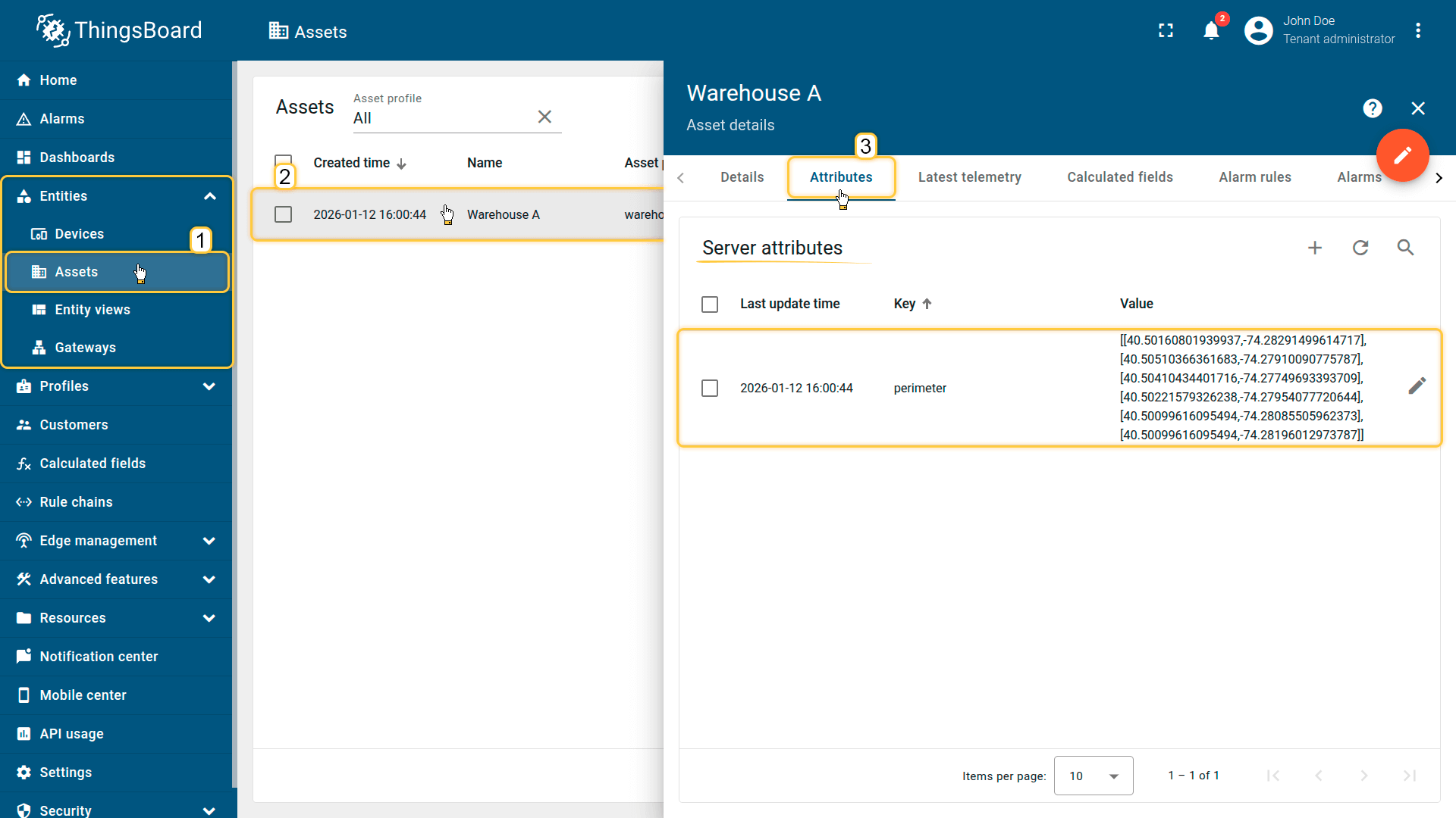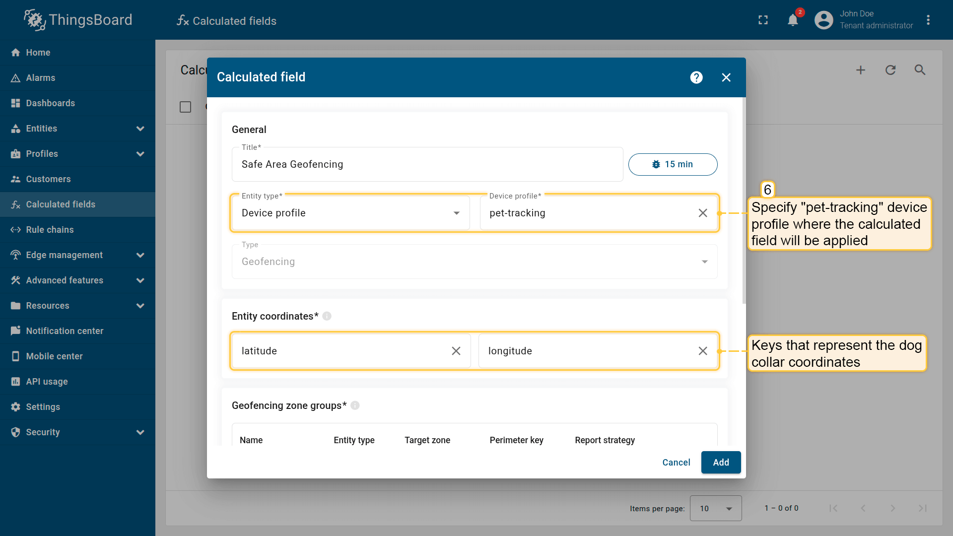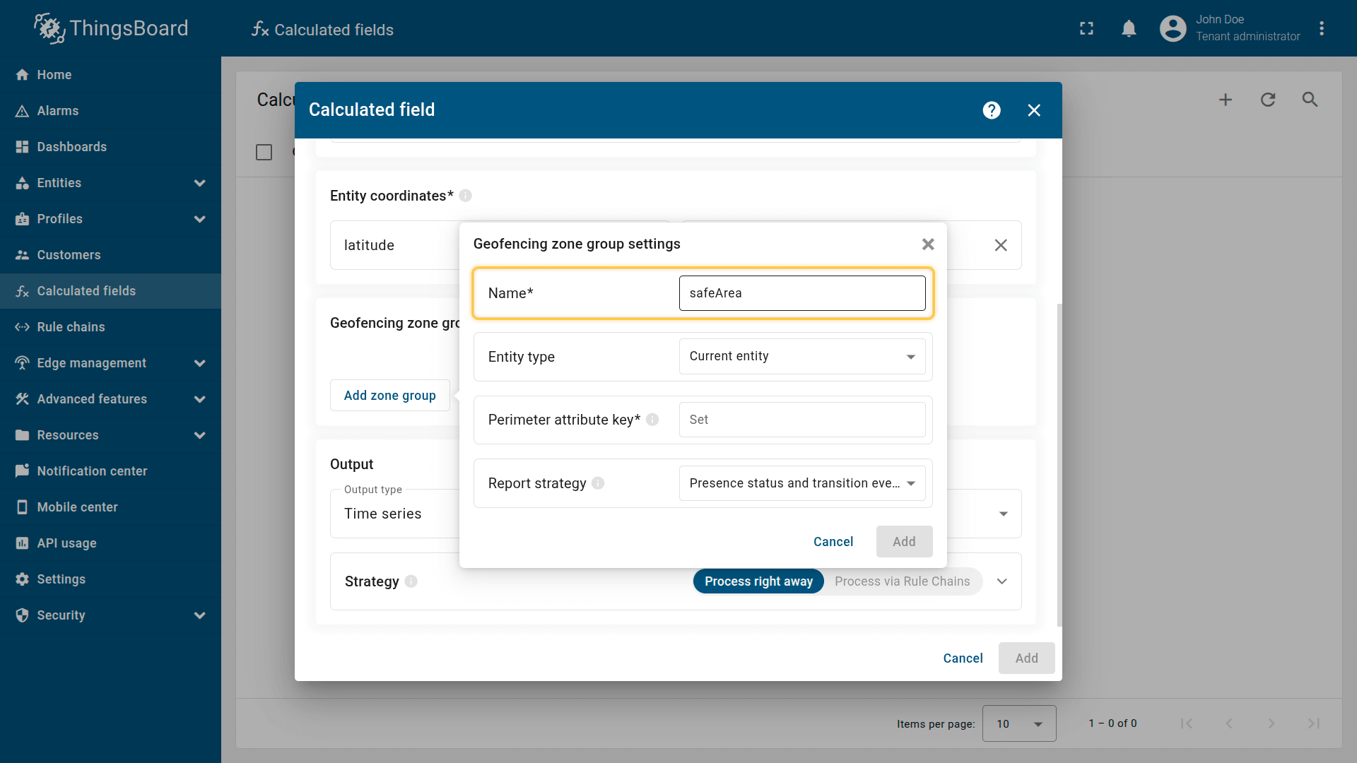 How it works: The calculated field retrieves the perimeter attribute from the Tenant or Customer that owns the entity. The device effectively inherits a zone defined at the business level.