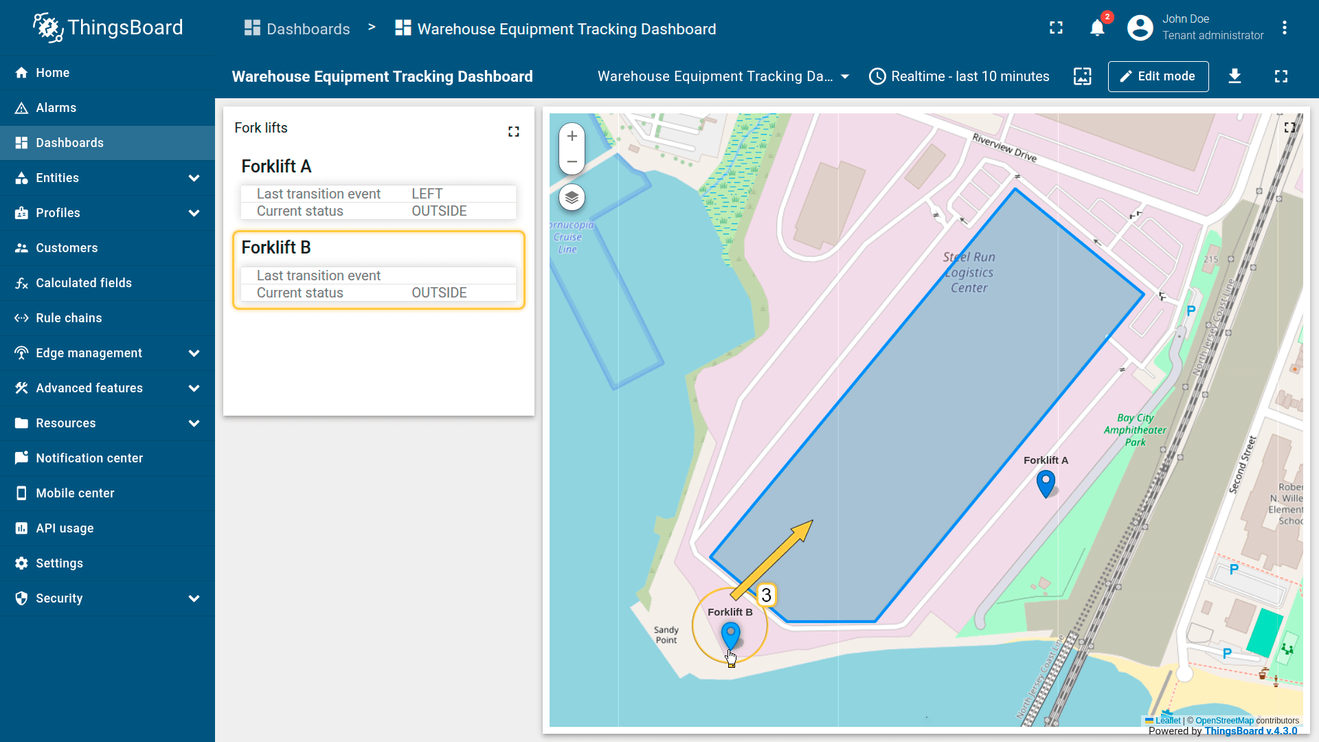 Detect when a forklift leaves the perimeter of its assigned building, and generate: