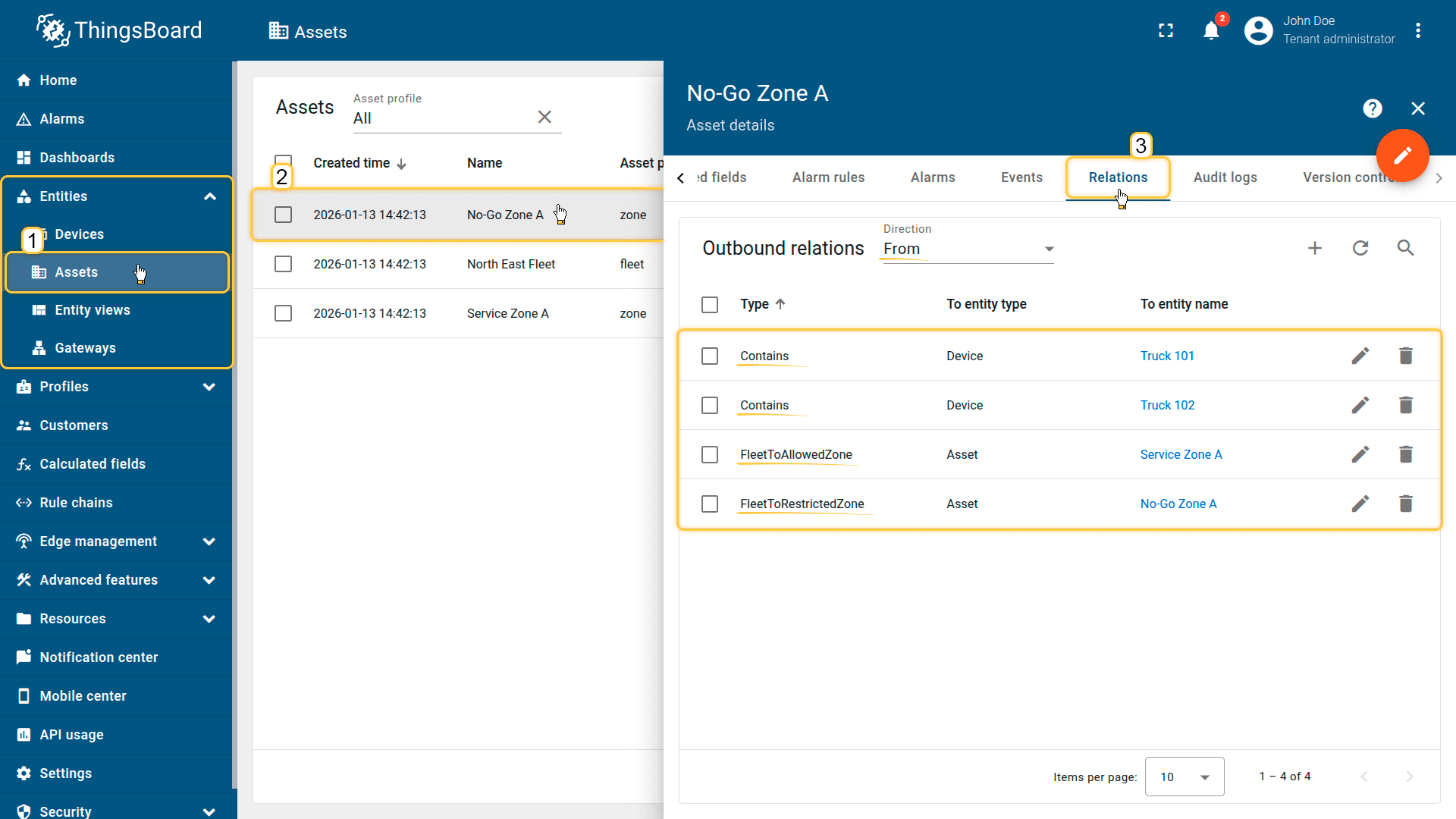 - Level 2: Direction: “Down”, Relation type: “FleetToRestrictedZone” (Finds all zone entities linked to that Fleet with the “FleetToRestrictedZone” relation type).