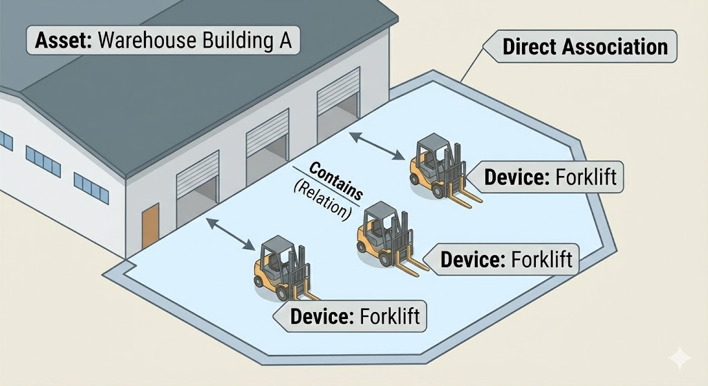 Create a relationship between the Warehouse Building A asset and the Forklift A and Forklift B devices.