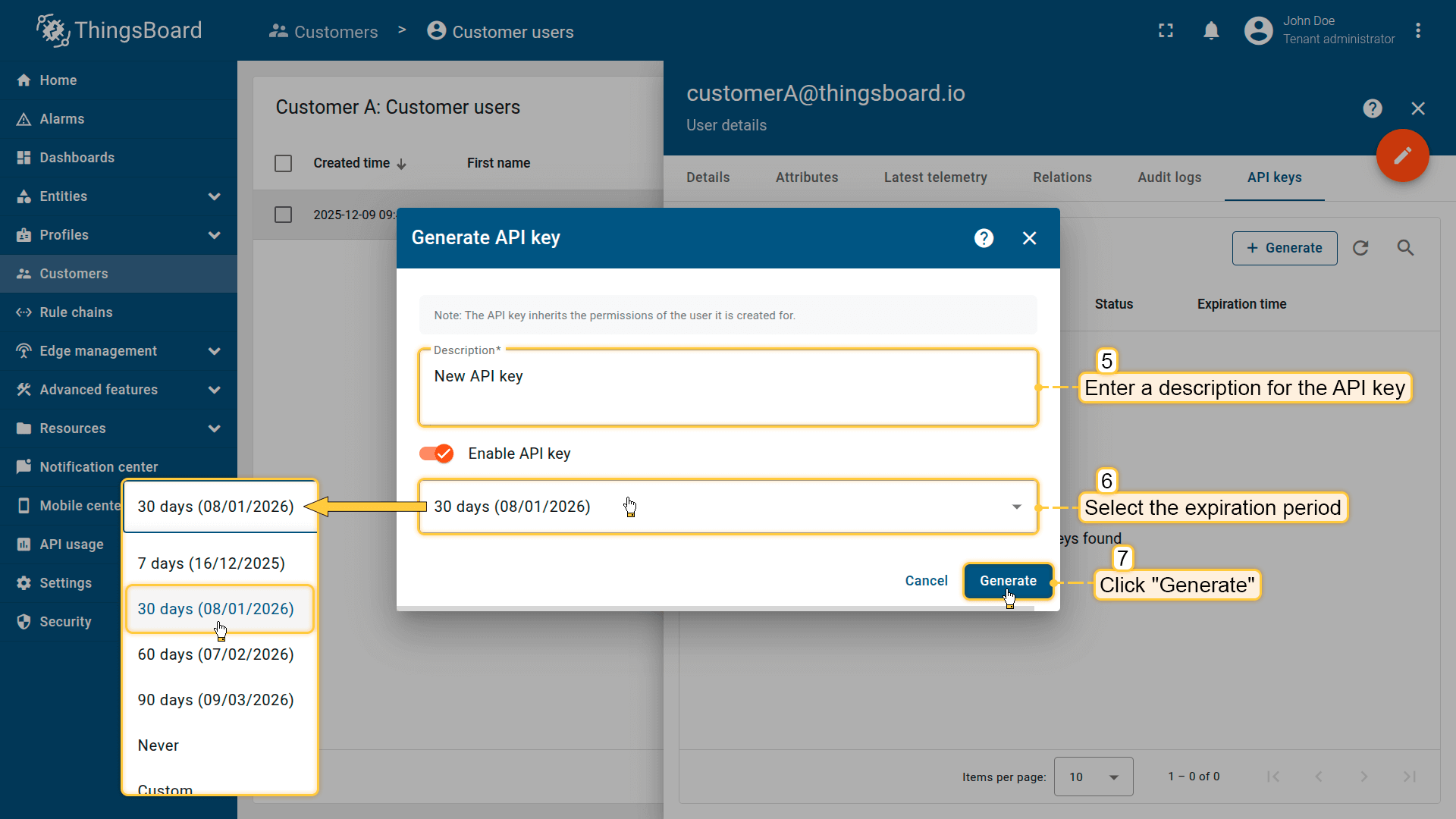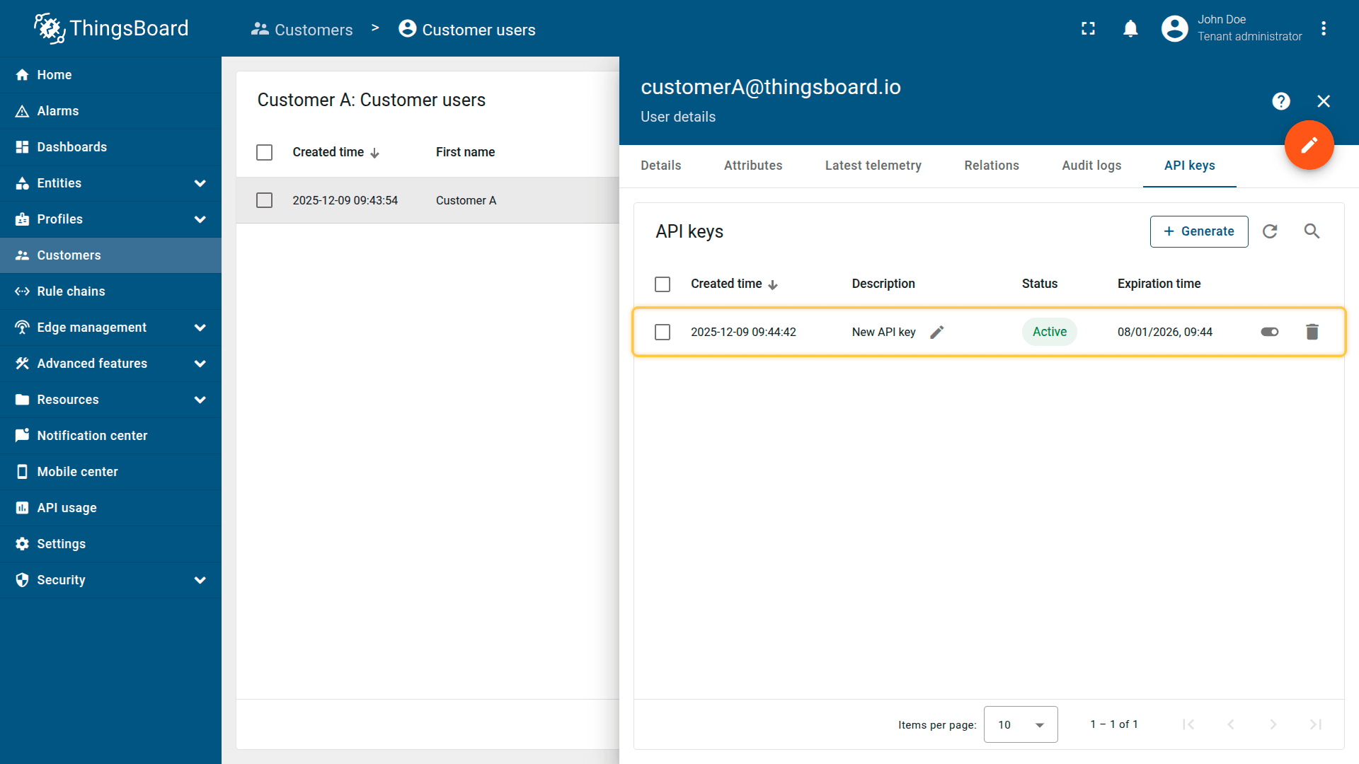 API keys can also be created directly from the user’s details page. A system administrator can create API keys for any users available to them (tenant users), and a tenant administrator can create API keys for their customer users. In the user details view, the API keys tab provides full access to API key management for that specific user.