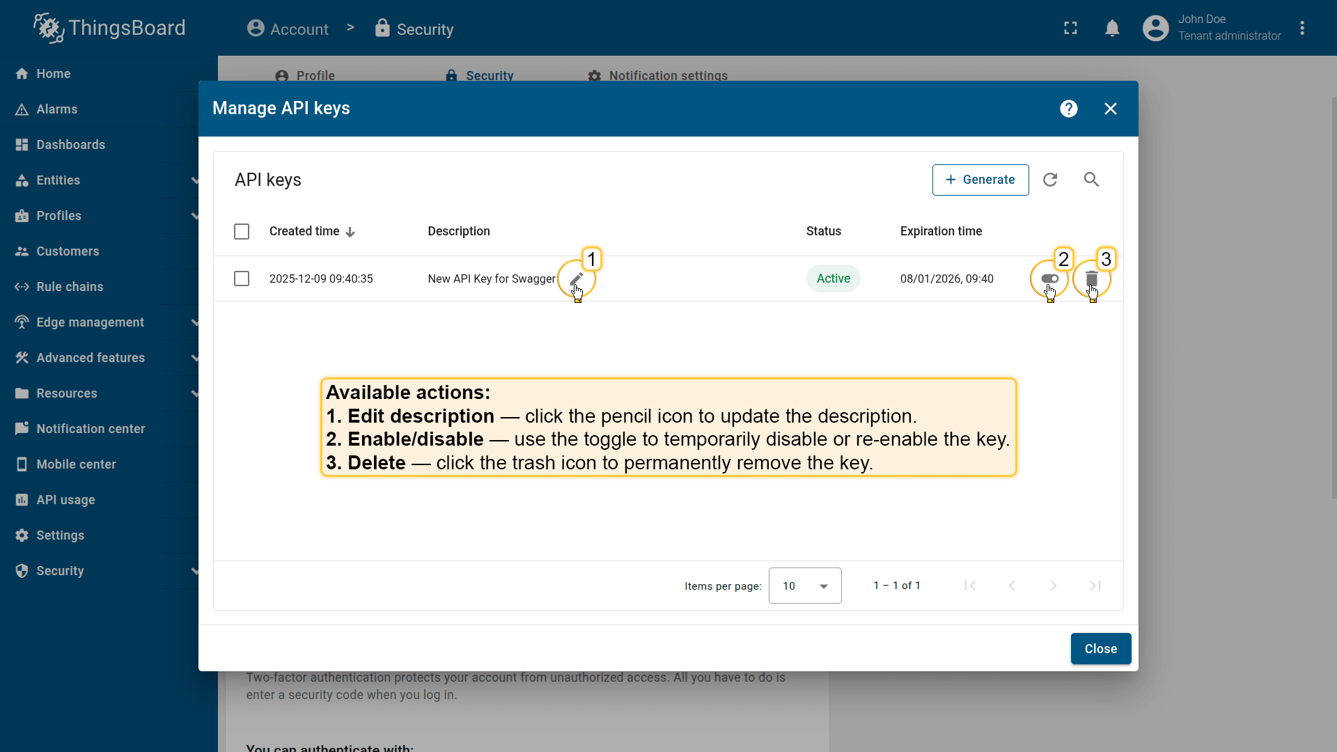 • Edit description — Click the edit (pencil) icon next to the description to update the API key’s description.