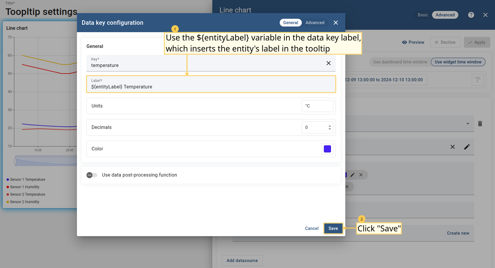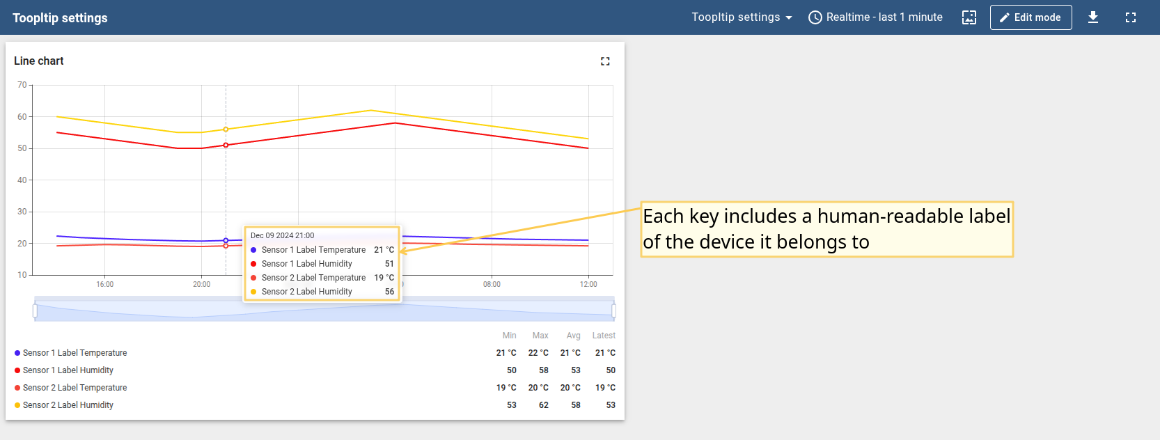 You can customize the values that will be displayed in the tooltip via tooltip settings or Advanced Data key configuration. Tooltip configuration via Settings is basic and applied to all entities at the same time. When configured in the Advanced Data key configuration, it is applied only to the specific time series data, and the basic tooltip function will be overwritten by this configuration.