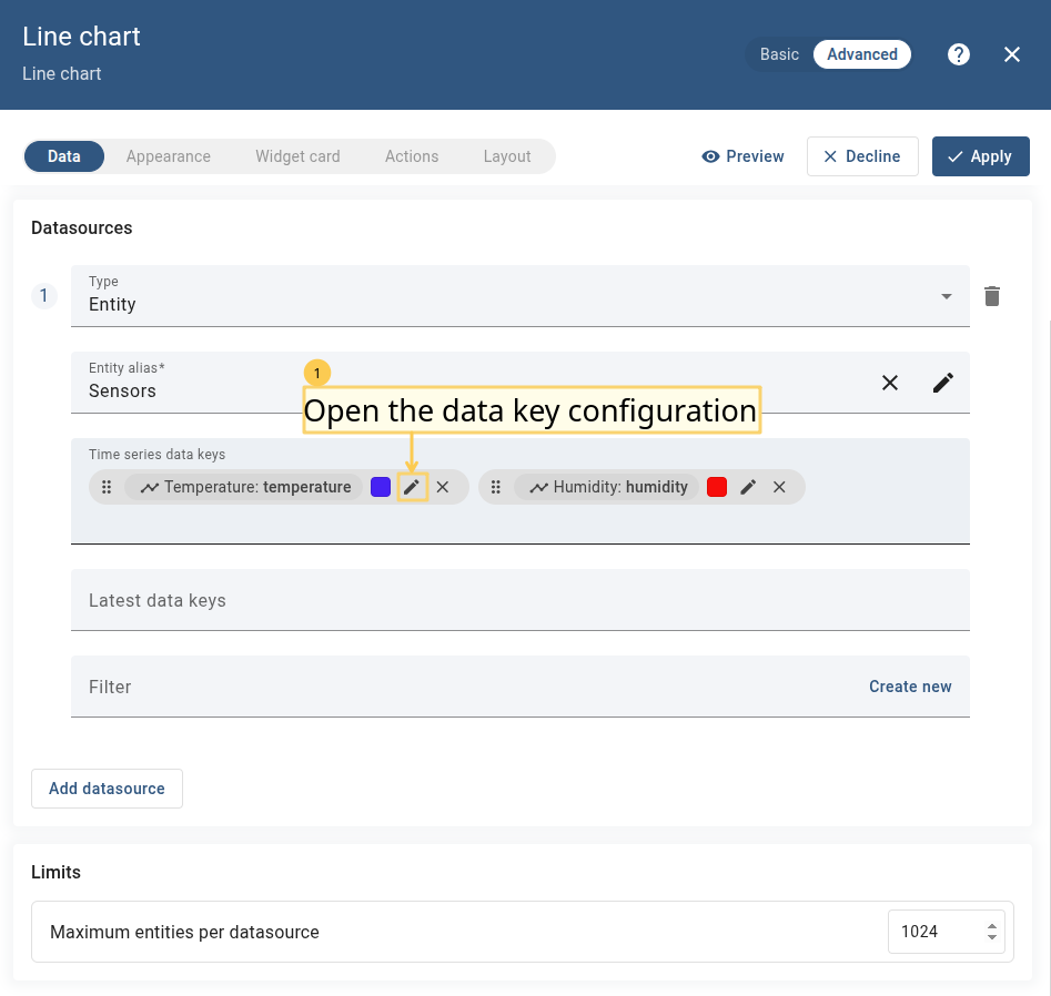 - Enter widget edit mode, specify the data source, add the required data key(s), and apply changes.